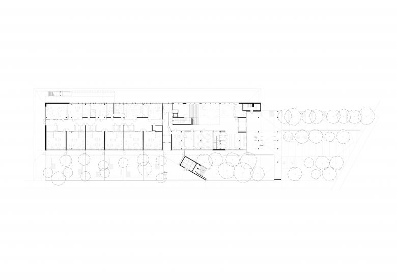 The ASO (general special school) is laid out in the western half of the building at ground floor level, the entrance and common area of the VS and ZMS and the day care area are in the eastern half, facing Schulstraße. On the first floor, the south-facing special teaching spaces are located in the western half, as are the rooms for the school administration and the teaching staff, which face north, as well as the gymnasium at the end of the building. The rooms for the ZMS are in the eastern half of the building and can be reached directly via the main entrance zone. The second floor is occupied entirely by two similar class clusters with teaching and outdoor spaces. Here, too, large terraces – some with a pergola – are envisaged.