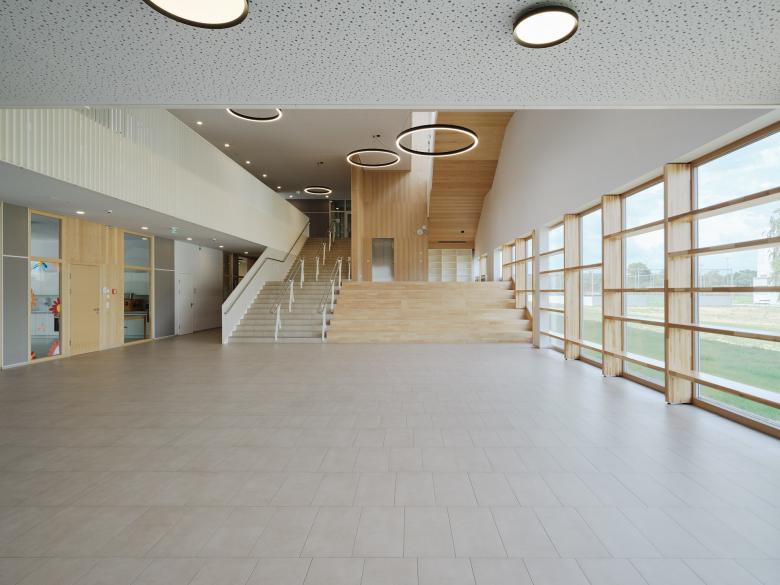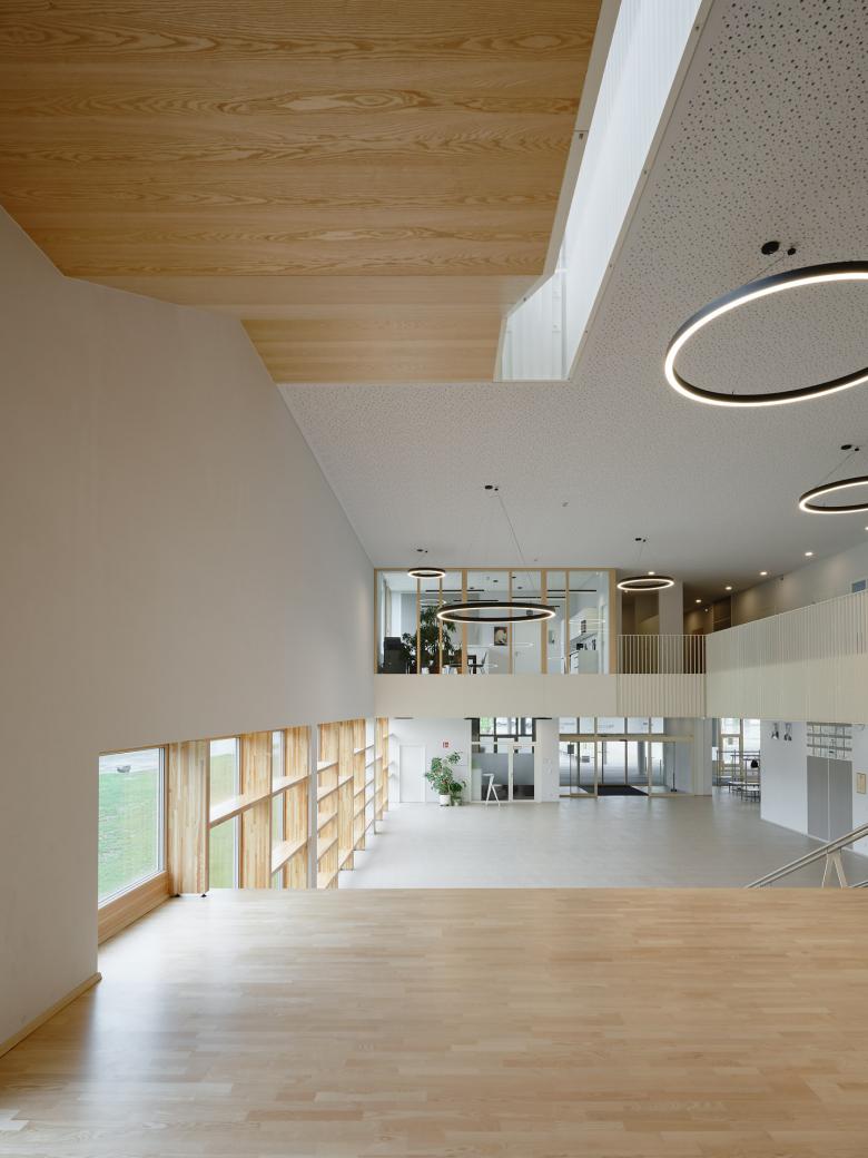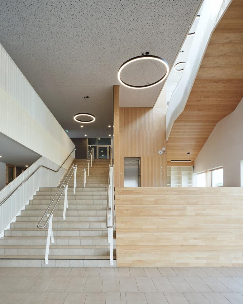 This Aula is an open space for life and action, conceived for the programs that accompany the teaching: these include day care facilities as well as various events. The leisure spaces are directly integrated in the Aula area – although they can be separated –together with the seating steps they form a generously dimensioned zone for a wide variety of activities. The library, an important part of the overall educational concept, is also integrated here and stimulates a playful approach to reading. The seating steps can also be used as an auditorium for the nearby ZMS or, conversely, as a stage for performances.