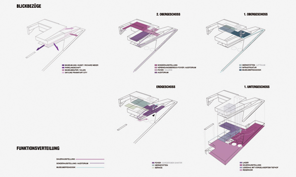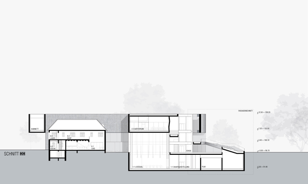 Selbst die seitliche Abschlusswand des Auditoriums zum Foyerraum hin widerspiegelt in ihrer Plastizität die graduell sich „verfestigenden“ Ausformungen der Freiraummerkmale zu einem gebauten Konstrukt. Nach, unter und hinter diesem artikulierten Freiraumbezug bilden sich die Ausstellungs- und Veranstaltungsbereiche als rationales, offenes und flexibel zu bespielendes Raumgefüge aus. Sosehr die Schwellenbereiche noch gewissermaßen inszeniert sind, bleibt der Charakter des nachfolgenden Raumes besonders von seinen Inhalten, von den Objekten und der Gestaltung der Ausstellung her, bestimmt. Der Raum soll die Artefakte zur Entfaltung bringen und hier tritt der Besucher in den konzentrierten Dialog mit dem Gegenstand. Insbesondere der Wechselausstellungsbereich hat die Eigenschaften eines White Cube und demonstriert mit seiner reduzierten Form nochmals exemplarisch die absolut funktional angeordneten dienenden Bereiche des Museums in diesem Trakt. Hier gliedert sich der Bau mit einer harten Kante in die Baumassen der Blockrandbebauung ein und bildet eine markante Fassade zur Metzlerstraße hin.