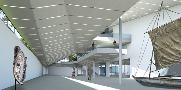 Sowohl der Ort, als auch das Programm für das Museum der Weltkulturen in Frankfurt am Main bestimmen das Gebäude in seinen wesentlichen Eigenschaften. Es ist ein Gebäude, das sein Selbstverständnis aus dem Dialog mit dem prägenden Umfeld und seinen Charakter aus der Vorgabe des Nutzers entwickelt. In subtiler Geste nimmt das Bauwerk große Rücksicht auf die gewachsene Natur und entfaltet mit Bedacht in die Parklandschaft eingeschriebene Strukturen zu einer modulierten Gesamtgestalt im Eingangs- und Erschließungsbereich des Museums.