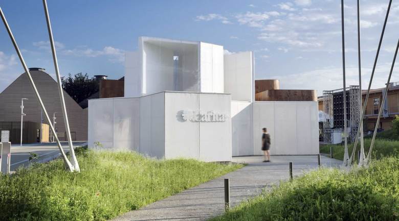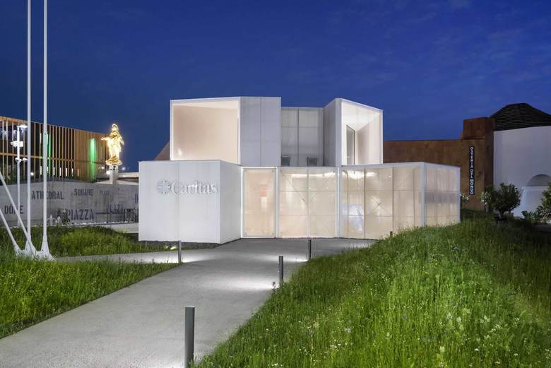 “Divide to multiply. Breaking the bread” is the theme represented in three dimensions in the pavilion with which Caritas takes part in the Expo; indeed, the architectural concept centres around the idea of sharing as an opportunity. The Edicola, this is the name of the small pavilion, has the appearance of a fragmented cube, the structure has been designed keeping simplicity at the core of its composition and the unadorned nature of its appearance. The structure is divided into 5 structures that are similar to each other but of different sizes and designed for different purposes. They are positioned on the ground and joined by vertices, a reference to the Edicola’s typical square floor plan. The uniformity of the construction is provided by its structural profile characterized by the same external dimensions, colour and materials. Thanks to its extremely simple structure, the Edicola is truly eco-sustainable. Externally, it is made of plastic pretensioned mesh that lets the air flow through without any need for air conditioning and lets in natural light which helps keep energy use to a minimum.