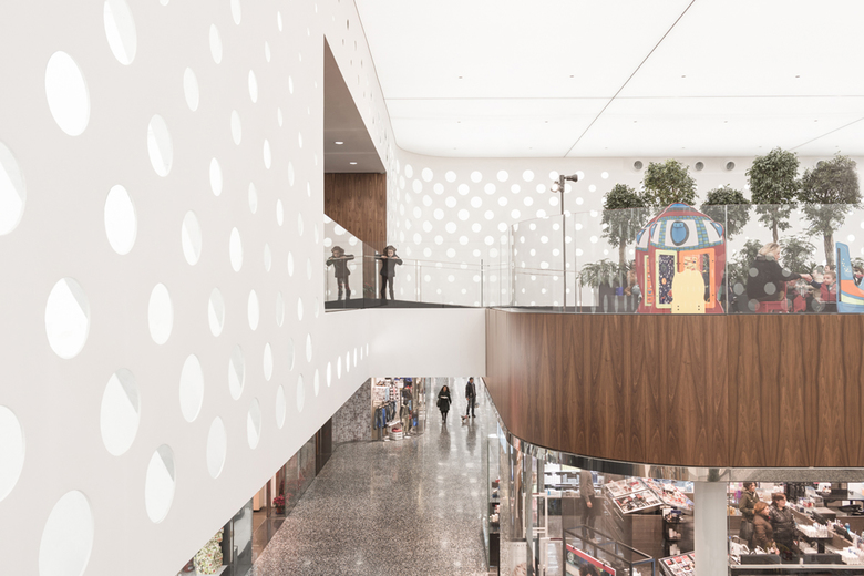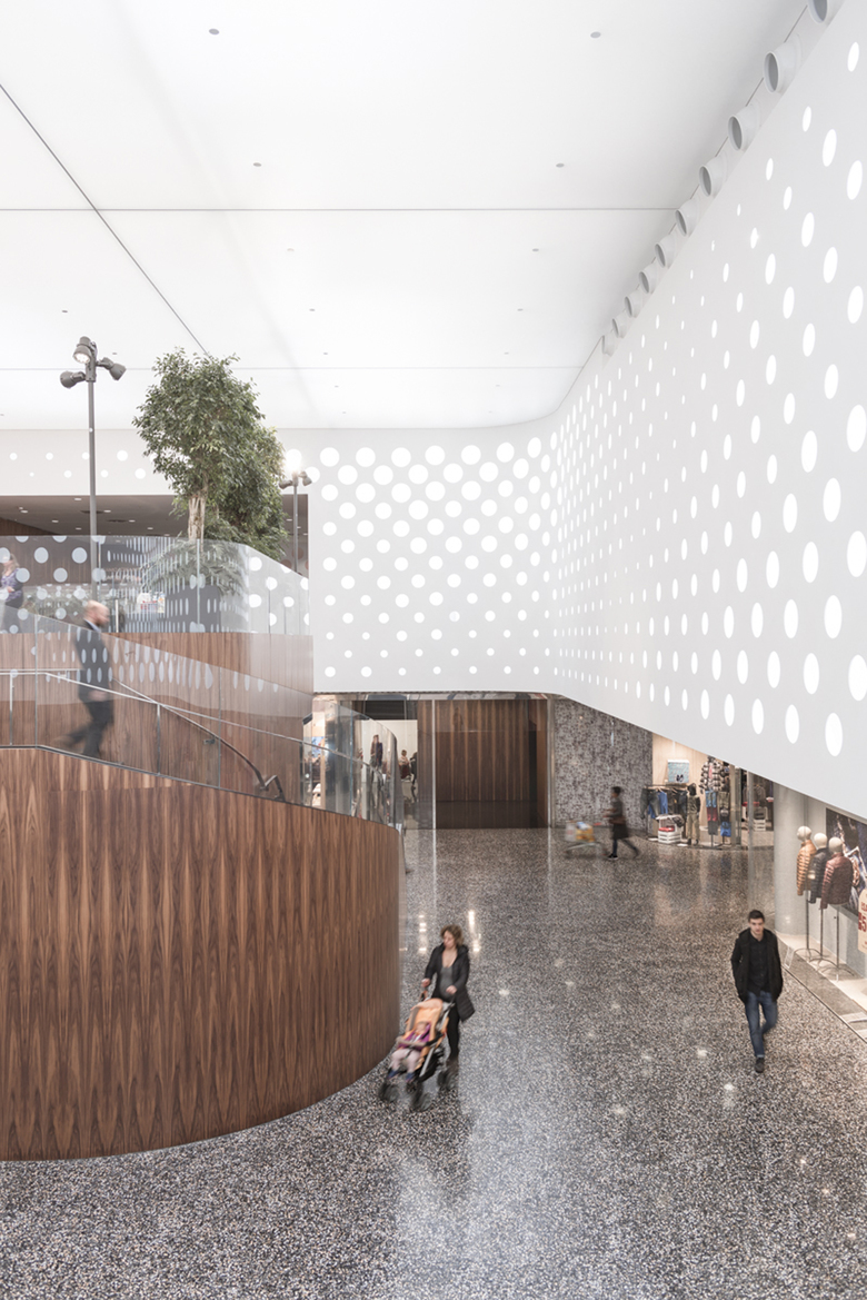 Inside, the perforated grid theme is continued also in the ceilings of the shop galleries, based on the idea of the street and the square, according to a natural continuation of the layout of the city.