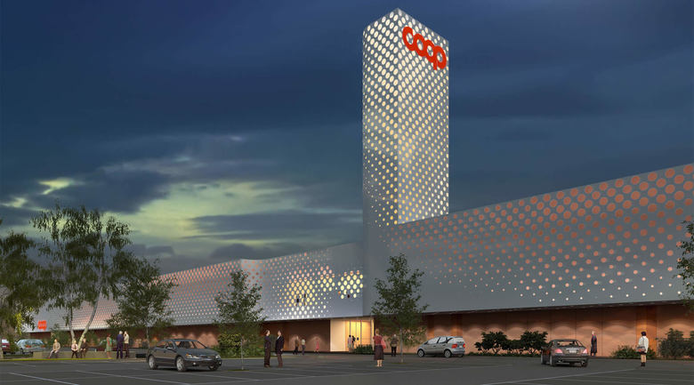 On the outside, two overlapping strips create the façade: the base, articulated by a mélange of colors recalling the bricks of Arezzo, is contrasted with a continuous strip of white fiberglass, defined by circular openings with a diameter varying from 20 to 50 cm that create a dynamic optical effect. Inspired by the graphics of the Coop logo, the same pattern thus identifies the surface of the tower, conceived by Piuarch with the aim of establishing a direct dialogue with the historical setting and landscape of Arezzo.