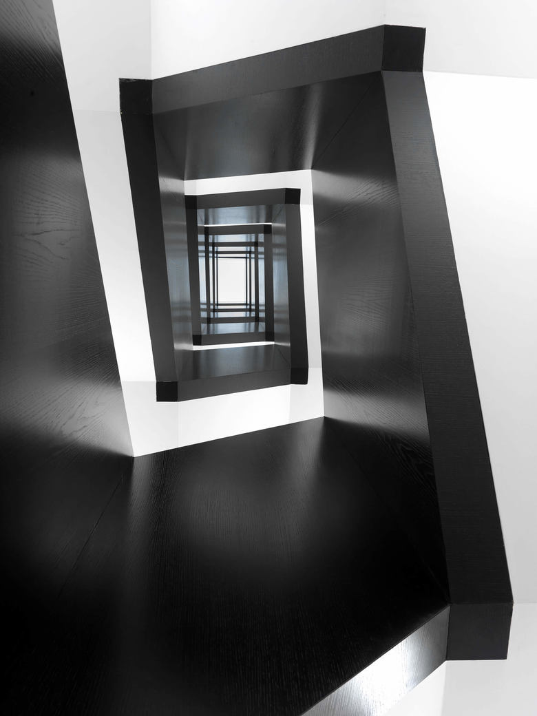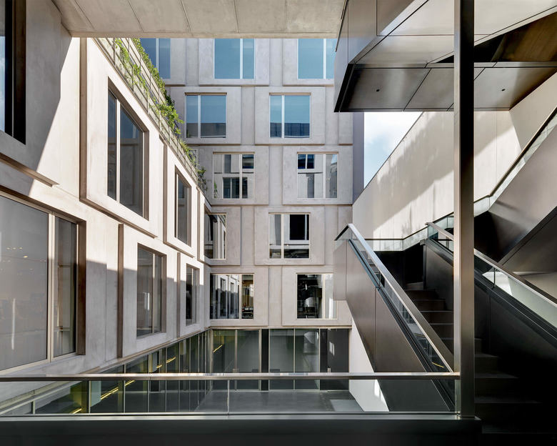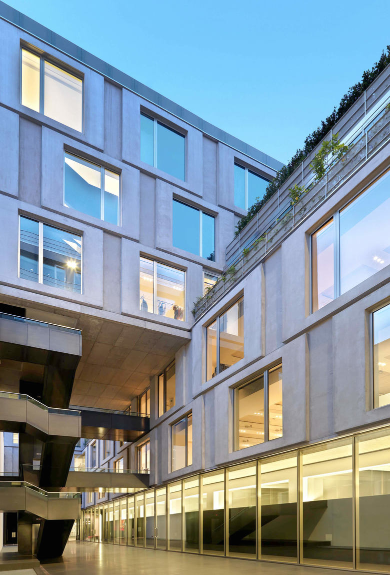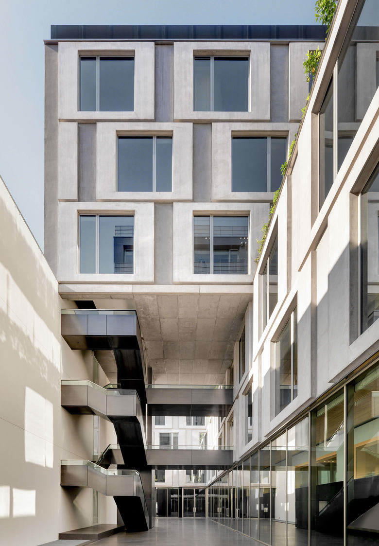 The elevation towards the street is characterized by sunscreens shutters made of steel. Set out in a displaced square pattern of 3,60 m x 3,60 m, the sunscreens create shafts of light and very precise, clear-cut forms making the façade look like an elegant garment stitched by a skilled tailor. The stylistic language used on the road front contasts with the more austere design of the elevations overlooking the courtyard, where the theme of squares is taken up again only this time through GRC (glass fibre reinforced concrete) panels.