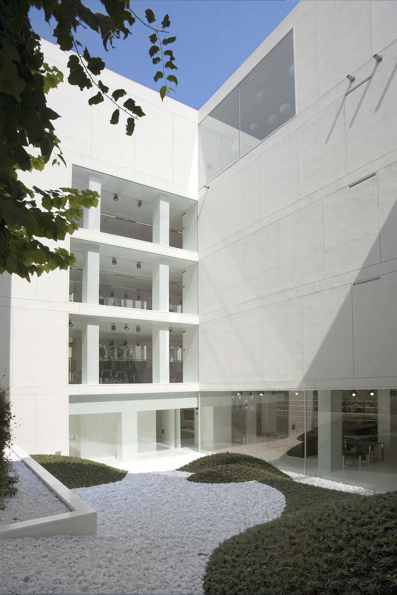 The ground floor opens onto an interior courtyard paved with white stones bordered by sinuously contoured garden areas.