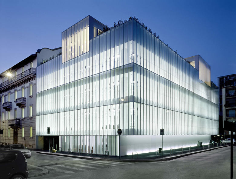 Situated just a few hundred metres from Corso Buenos Aires, the Dolce&Gabbana offices and showroom in via Broggi, Milan, is a combination of classical and contemporary, smoothly interacting with the surrounding cityscapeThe 1920s’ building, used for offices and reception spaces, is enhanced by focusing on its architecture and maintaining its elegant, classical style. The 1960s’ building, used as a showroom, has been completely hollowed out to create a 3-storey open space crowned by small terraces constructed out of the restaurant structures. It completely changes skin on the outside, cladding itself with glass in a very tightly-knit modular pattern. This gives it a much more contemporary feel, which seems to create a subtle line of rupture between the two buildings, whereas it is merely a junction line. The glass structure turns into an almost immaterial prism, thanks to the choice of reflective materials (glass and shiny steel sheets) enveloping it in an aura of eclecticism by means of simple forms described by the effects of shadow and light during the day. The building creates a large front of diffused light offering glimpses of garments from the fashion house’s collection, which run along the perimeter of the façade. The building’s transparency opens it up to the city and passers-by, stitching it back together with the neighboring building. Transparency emerges from the façade design featuring a regular pattern of vertical sunscreen shutters made of opaline glass, partly inspired by a work by the British artist Damien Hirst entitled “Some Comfort Gained from the Acceptance of the Inherent Lies in Everything” from 1996. Hirst showcases the bodies of two cows. In the same way, Piuarch seems, at least on the outside, to be sectioning the showroom’s large open spaces into lots of separate windows, focusing on every individual item of clothing from the collection in via Broggi.
