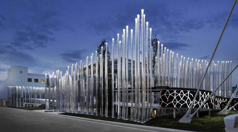 In designing the ENEL Pavilion for Expo 2015, the concept of “energy sharing” become an architectural theme, with the creation of a virtual volume: a place, generated by a grid onto which 650 polycarbonate vectors are grafted, they express the innovation of the smart grid. The pavilion occupies an area of 900 sqm, overlooking the Decumano. The initial matrix of the project is the intelligent network that ENEL created to power the EXPO site; grafted onto the network are vectors that represent the system’s nerve endings, the vectors create a virtual forest, illuminated by a series of LED lights. Enel Pavilion offers an experiential path, the visit is immersive and proposes a playful aspect that allows the visitor to penetrate freely into the “forest” and to interact with the vectors through unexpected situations of light and sound.