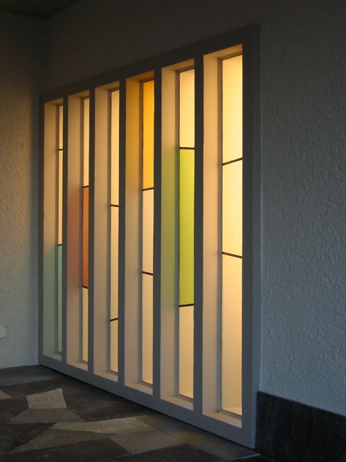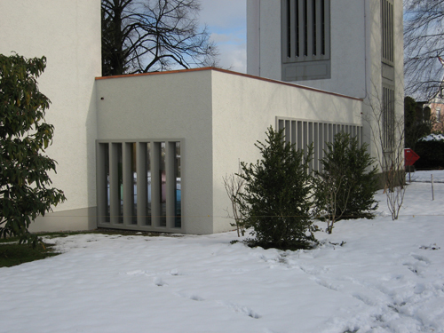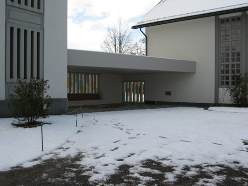 Die Architektur des neuen Anlageteils orientiert sich an der Formen- und Materialsprache der bestehenden Gebäude. Der Neubau soll sich unmerklich zwischen die Nachbarbauten schieben, ohne Nahtstellen zu hinterlassen. Dach, Wand und Boden sind in Massivbauweise vorgesehen. Das Dach wird mit den seitlichen, statisch wirkenden Brüstungen zwischen die Mauern von Turm und Kirche gespannt. Eine extensive Begrünung sorgt für eine ökologische Ausgleichsfläche. Als Bodenbelag sollen die gleichen, wildförmig verlegten Natursteinplatten verwendet werden wie beim Kircheneingang. Die lamellenartige Rückwand besteht abwechselnd aus schmalen Betonpfeilern und geätzten Gläsern. Damit wird einerseits der Sichtkontakt unterbunden und andrerseits eine angenehme, blendfreie natürliche Belichtung gewährleistet. Mit der Verwendung von farbigen Gläsern entsteht eine feierliche Atmosphäre. Die neue Halle soll damit einen würdigen Rahmen bilden zu den darin stattfindenden Abdankungszeremonien.