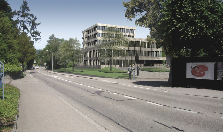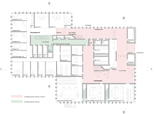 Die heutige parkartige Situation entlang der Rheinstrasse als charakteristisches Merkmal am Stadteingang von Liestal soll erhalten und gestärkt werden. Aus diesem Grund wird das neue Gerichtgebäude von der Rheinstrasse zurückversetzt und die parkartige Bepflanzung ergänzt. Die Volumengliederung des Gebäudes entspricht den inneren Funktionen: Die Büros der drei Gerichte (Kantonsgericht, Steuer- und Enteignungsgericht, Bezirksgericht Liestal) und ihre Kanzleien befinden sich im 6-geschossigen Bürotrakt; die Gerichtssäle und die gemeinsamen Nutzungen der Büros im 3-geschossigen Gerichtssaaltrakt. Die klare Trennung von intern und extern genutzten Bereichen bietet gute Voraussetzungen für effiziente, sicherheitstechnisch optimierte Abläufe.