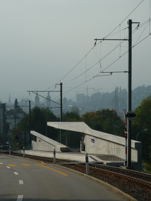 Die neu erstellte Haltestelle der Appenzeller Bahnen erschliesst das Neubaugebiet Birnbäumen und markiert an der Speicherstrasse den Eingang zur Stadt St. Gallen. Die horizontalen Mauerkronen thematisieren die markante Steigung der Strasse und inszenieren die Ausblicke auf die Stadt und den Bodensee.