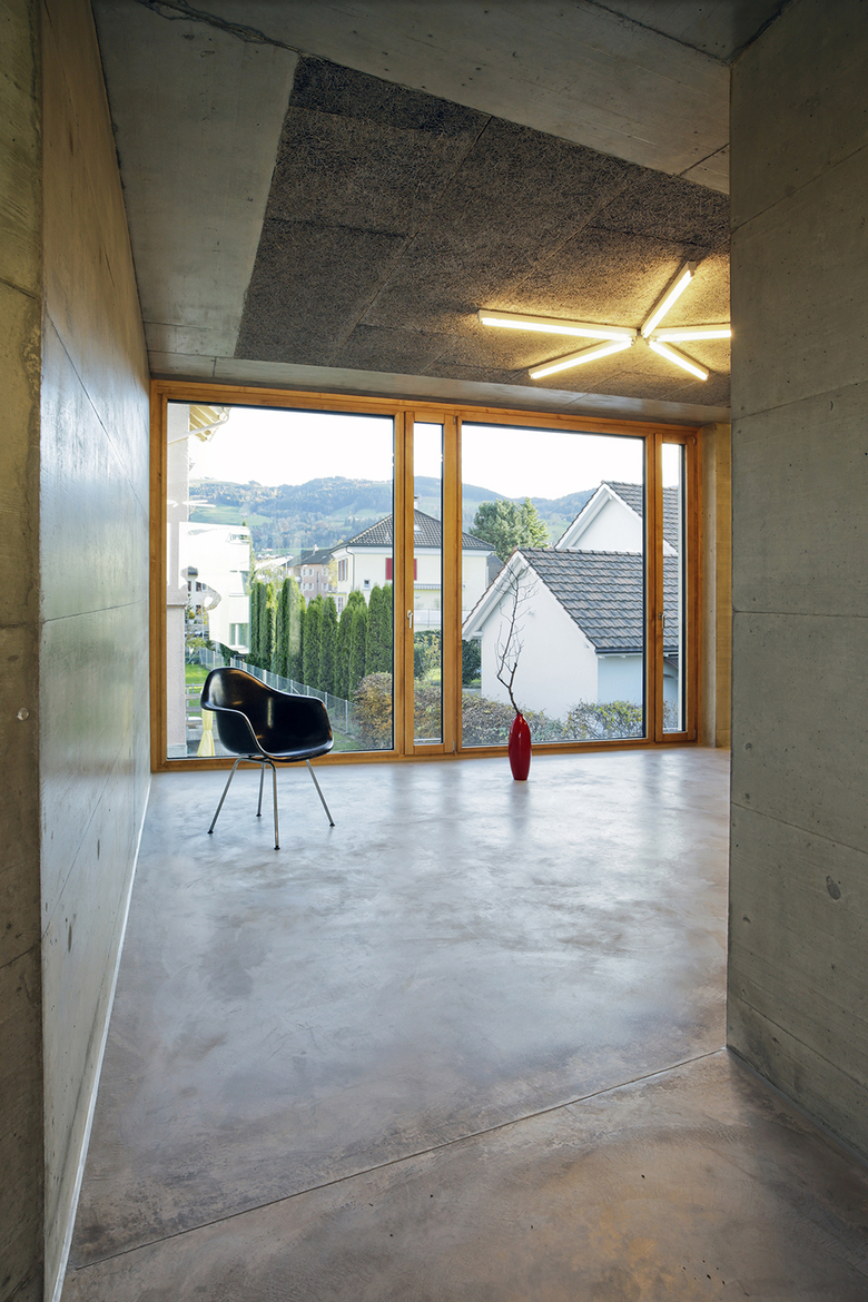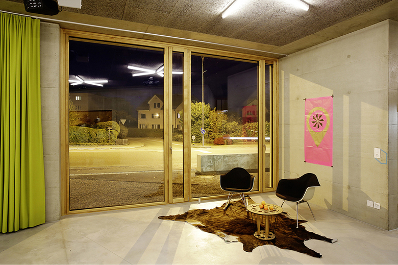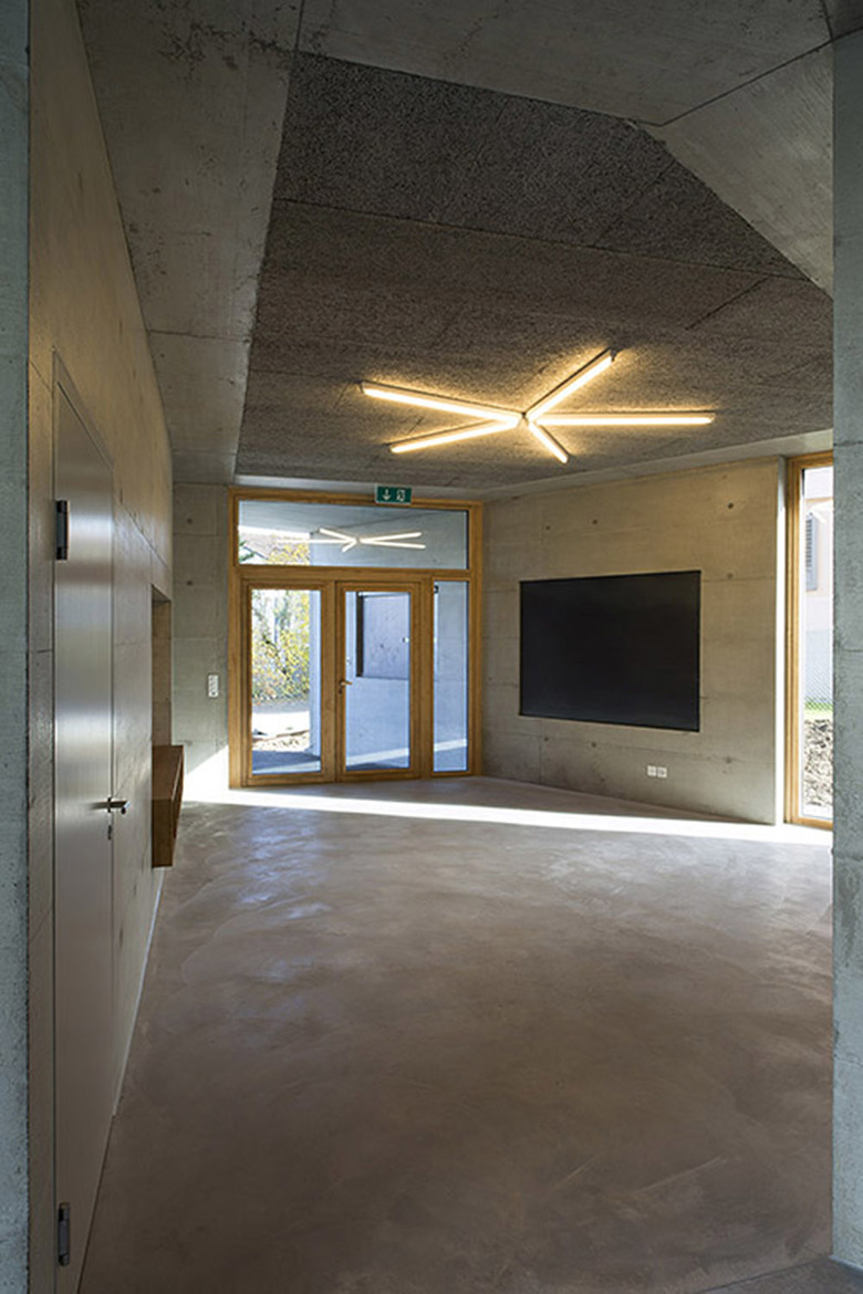Das Innere des Jugendhauses soll den Jugendlichen Gelegenheit geben, die Räume nach eigenem Gusto in Beschlag zu nehmen. Einfache, robuste und leicht zu unterhaltende Materialien prägen den Innenraum. Die Farbgestaltung drängt sich nicht in den Vordergrund, sondern bildet die Kulisse für verschiedenste Einrichtungs- und Gestaltungsideen. Boden, Wände und Decke präsentieren sich in einheitlichem Betongrau, Fenster und Einbauten aus Fichtenholz bilden einen starken Kontrast dazu und bringen wohnliche Wärme ins Haus. Zusätzlich geben sternförmig angeordnete Balkenleuchten den Räumen eine festliche Stimmung.