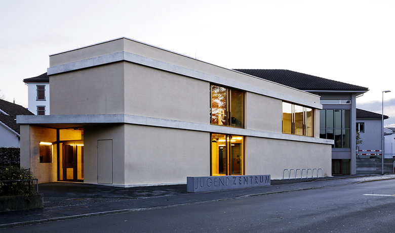 Der Neubau des Jugendtreffs präsentiert sich selbst bewusst an der heterogen bebauten St.Gallerstrasse. Der robuste und prägnante Baukörper prägt seinen öffentlichen Charakter. Der Zugang orientiert sich zur Strasse und dokumentiert trotz der Nähe zu den Schulanlagen Rosenacker die Eigenständigkeit des Jugendtreffs.