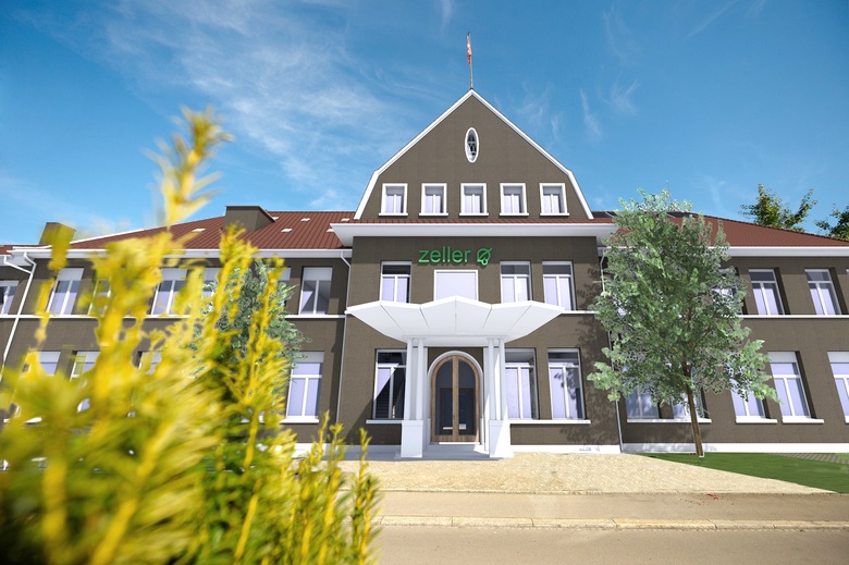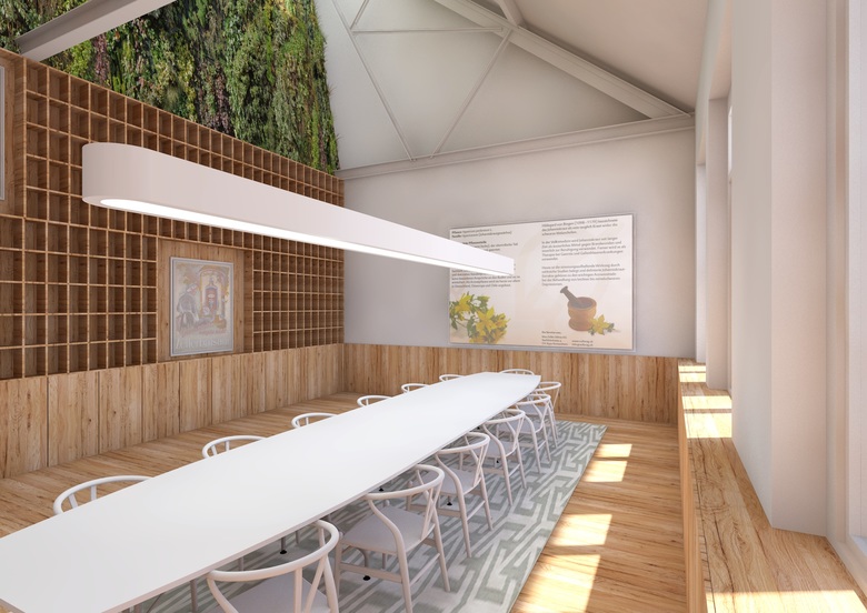 Die ursprüngliche Gebäudestruktur bleibt an den Unterzügen ablesbar. Der rückseitige Büroanbau im ersten Obergeschoss wird zugunsten einer begrünten Terrasse rückgebaut. Über einen "Kräutergarten" sieht man im neuen Empfangsbereich auf die bestehenden Produktionshallen.