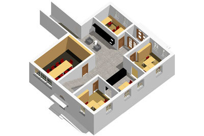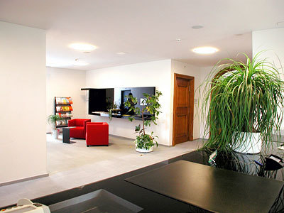 Die bestehende t-förmige Erschliessung wird durch einen zusätzlichen Seitenflügel für das Front-Office und den zur Wartenische vergrösserten Stichgang zu einem unregelmässigen Kreuz erweitert. Das Rathaus erhält dadurch einen zentralen Eingangs- und Empfangs-Bereich. Herzstück des neuen Front-Offices ist eine freistehende Theke. Nicht das Prinzip des klassischen Schalterbetriebs stand hier Pate, sondern die Idee einer Rezeption.
