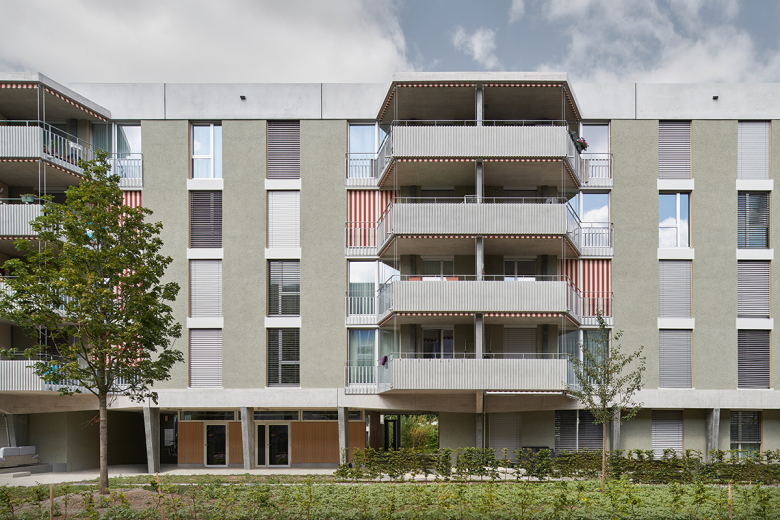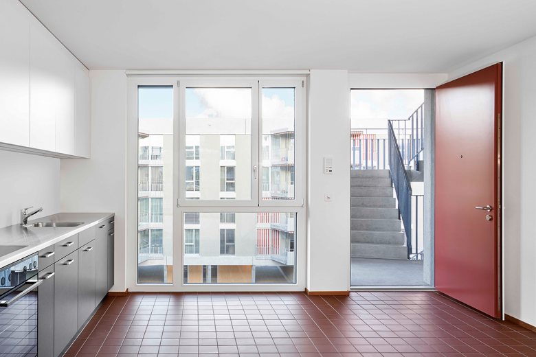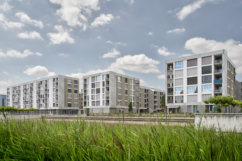 Je nach Lage und Gebäudetiefe werden unterschiedliche Wohnungstypen angeboten, die das differenzierte Raumprogramm abbilden. Speziell zu erwähnen sind die Wohnungen der Zeilenbauten am Gartenhof, die direkt vom Aussenraum erschlossen sind. Im Erdgeschoss sind die Bauten durchlässig und die vielfältigen Nutzungen sind über ein dichtes Netz an Wegen und Plätzen verbunden. Die Fassaden sind durch den Rhythmus der Balkone und Treppentürme gegliedert und bekennen sich mit den speziell ausgebildeten Sockelgeschossen und den kräftigen Dachrandabschlüssen zur Stadt.
