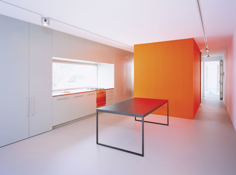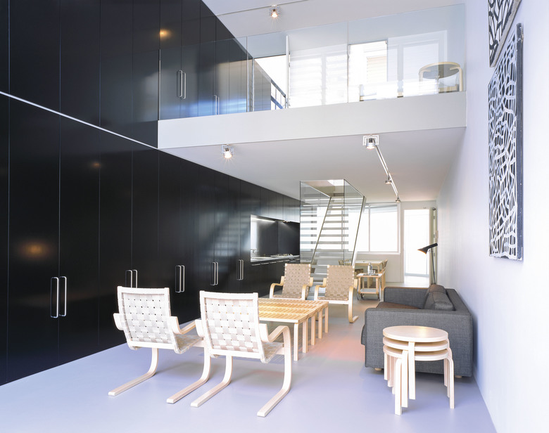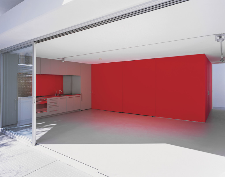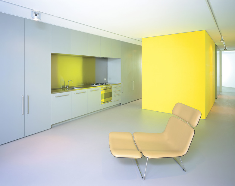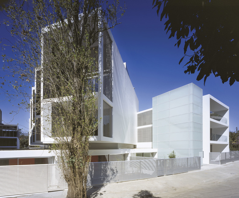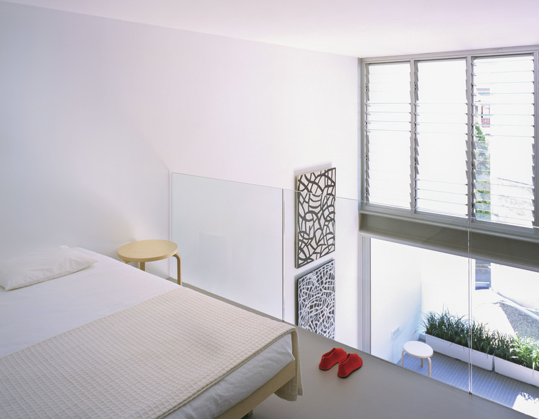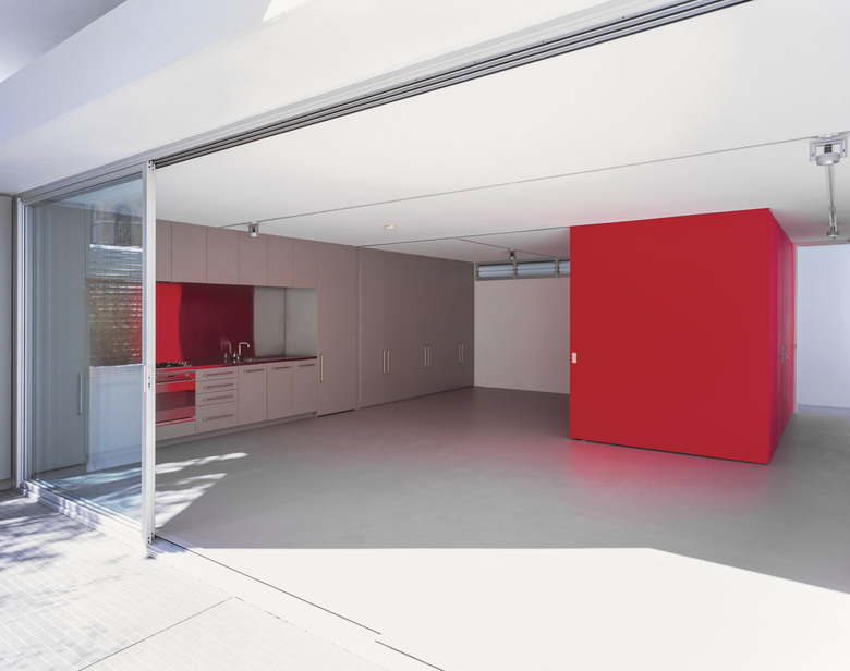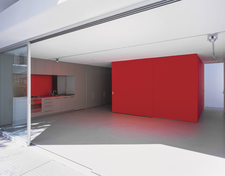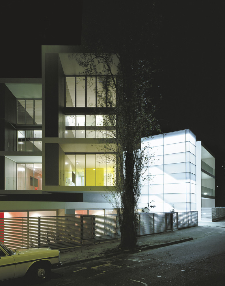 There are 7 different apartment types within the 26 unit development, the majority of which contain a "working wall" running the entire length of the apartment including the balcony. This "working wall" contains kitchens, laundries, wardrobes, studies and exceptional amounts of general storage. This wall is distinguished from the building shell by way of its coloured panels which are expressed externally on the balconies in contrast to the crisp white concrete structure. Bathrooms are typically expressed as fluorescent coloured free-standing pods placed at the centre of each apartment. They allow breezeways through to the bedrooms where the use of large sliding panels achieves flexibility between the need for privacy and the free flow of space. Double height living areas are introduced to upper level apartments expressed externally with double height balconies.