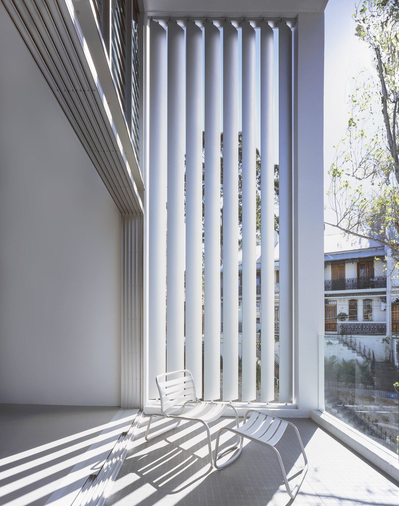 The design adopts passive environmental strategies. All units face north, north-east or north-west and are naturally cross ventilated. The sliding doors to the balconies slide away into a cavity in the "working wall" to seamlessly integrate interior and exterior space. Internal courtyards off bedrooms which are open to the sky, act as thermal chimneys drawing air through the apartments and share natural light with the common walkway through a translucent white