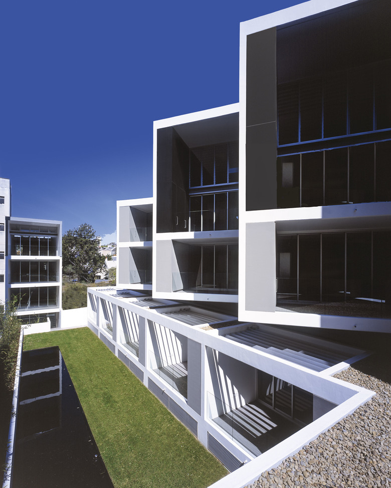 L shaped range of apartments forms a podium, above which a staggered mass cantilevers from a recessed transfer structure. The serrated plan of this upper section is generated by angling the apartments to face north. Completing this heavily articulated building form is a translucent white glass stair tower adjoining the main entry and a 3 level walkway giving access to the units, which is enclosed over much of its length by external aluminium louvres providing protection from the western sun, as well as natural ventilation.