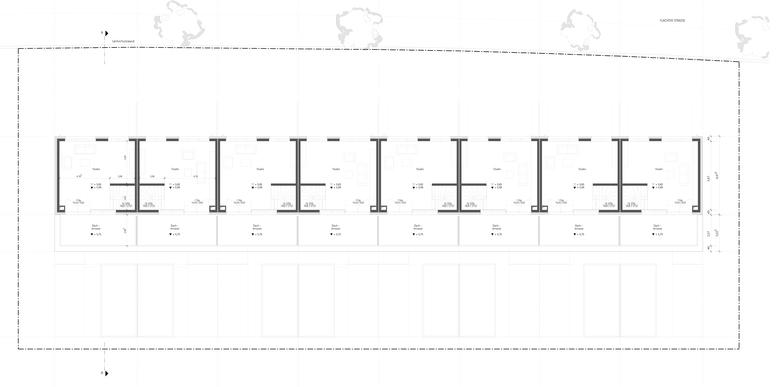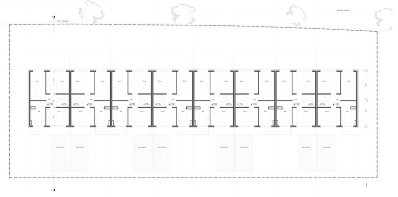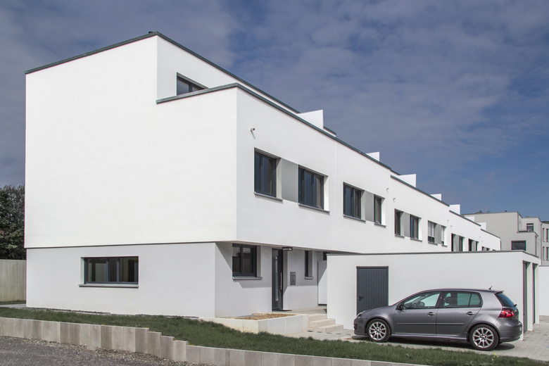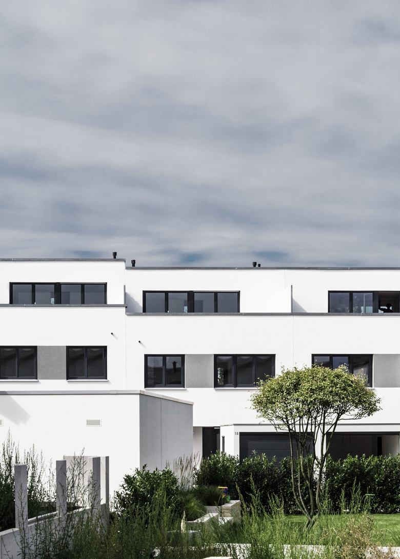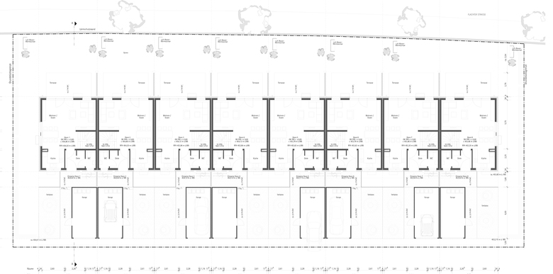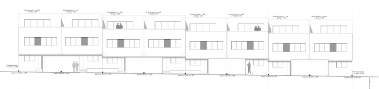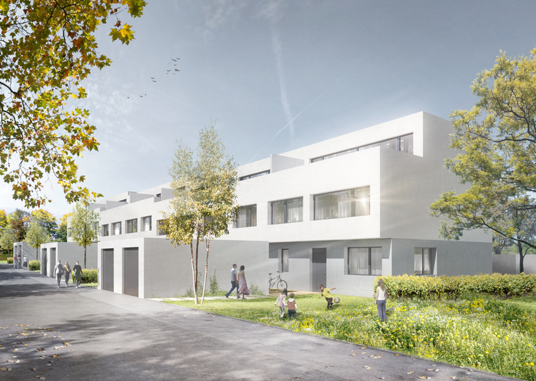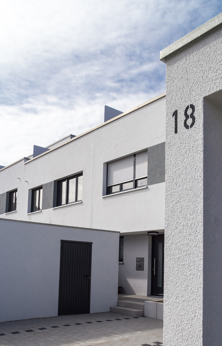 In Ruheheim entsteht ein Neubaugebiet. Hierbei wirkt unser Büro Architektur 6H mit 8 Reihenhäuser mit. Die Reihenhäuser sind zur östlich liegenden Ringstraße orientiert und bekommt somit eine Nord- Süd- Orientierung. Die Häuser reagieren mit kleinen Höhenversprüngen zueinander auf die abfallende Topografie. Das gesamte Grundstück erstreckt sich über eine Fläche von ca. 1.466m². So erhält ein einzelnes Grundstück im Durchschnitt eine Grundfläche von ca. 183m². Die Wohngebäude erstrecken sich über vier Geschosse, wobei das Erdgeschoss etwas zurückgesetzt wird, dadurch entsteht ein überdachter Eingangsbereich. Auch das 2. Obergeschoss bzw. Das Dachgeschoss wird zurückgenommen, wodurch eine Dachterrasse Richtung Osten entsteht. Eines der Häuser hat ca. 174m² Wohnfläche (inkl. Kellergeschoss). Auf der Rückseite der Häuser befinden sich eine weitere Terrassen mit Gartenanlagen. Diese ist Richtung Westen zur Flachter Straße orientiert und haben durchschnittlich eine Fläche von ca. 45m². Um dem Lärm der Flachter Straße zu mildern, wurde zwischen Garten und Straße eine Schallschutzwand erbaut. Jedes der acht Grundstücke verfügen über einen Garagenstellplatz und einen Stellplatz im Freien.