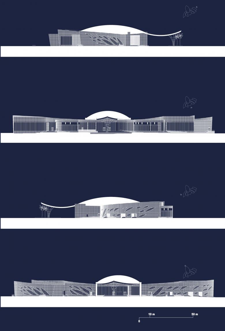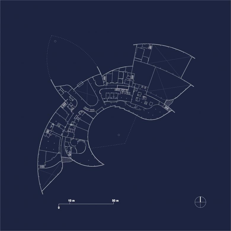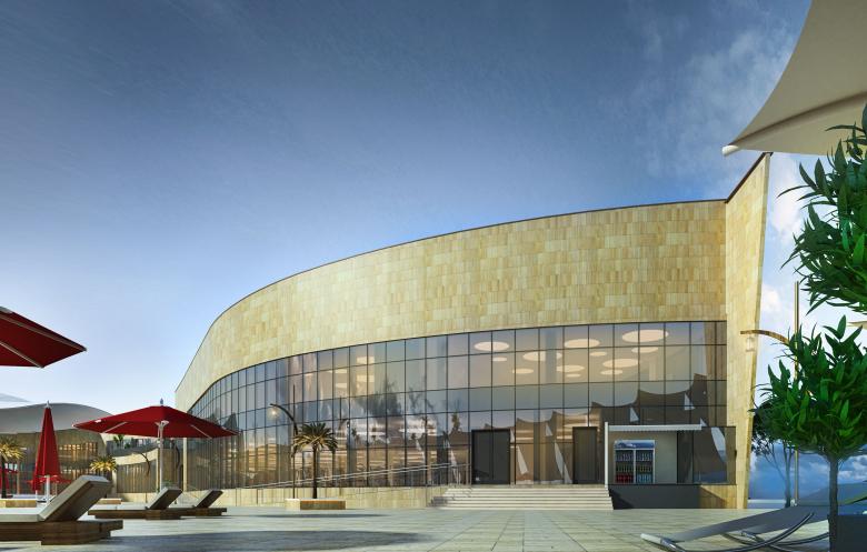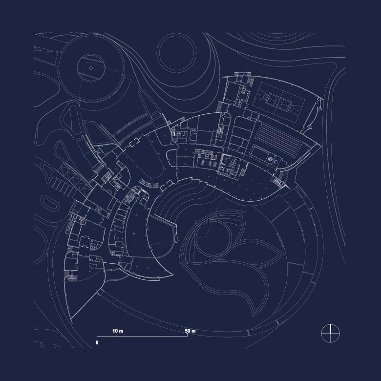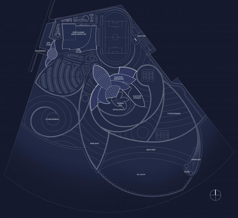 The modern and organic architecture of the club house (the 12,000 sqm main building) recalls the floral forms in plan: the client's request was to have a unique building, highly iconic and with sinuous and non-rigid shapes. The sinuous forms have generated fluid and unusual spaces that make this architecture highly characterizing. The plant embraces a semi-covered central space is called Festival Space. In this space there are the outdoor swimming pool and the solarium area overlooking the park and the beach.