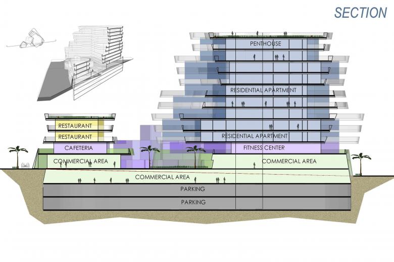 The podium levels will be used for high end retail outlets, with fully equipped gym and spa. The shape of the plot and the surrounding streets provide an excellent area for the design, especially with the differences of street levels that provide an immediate entry to the underground parking.