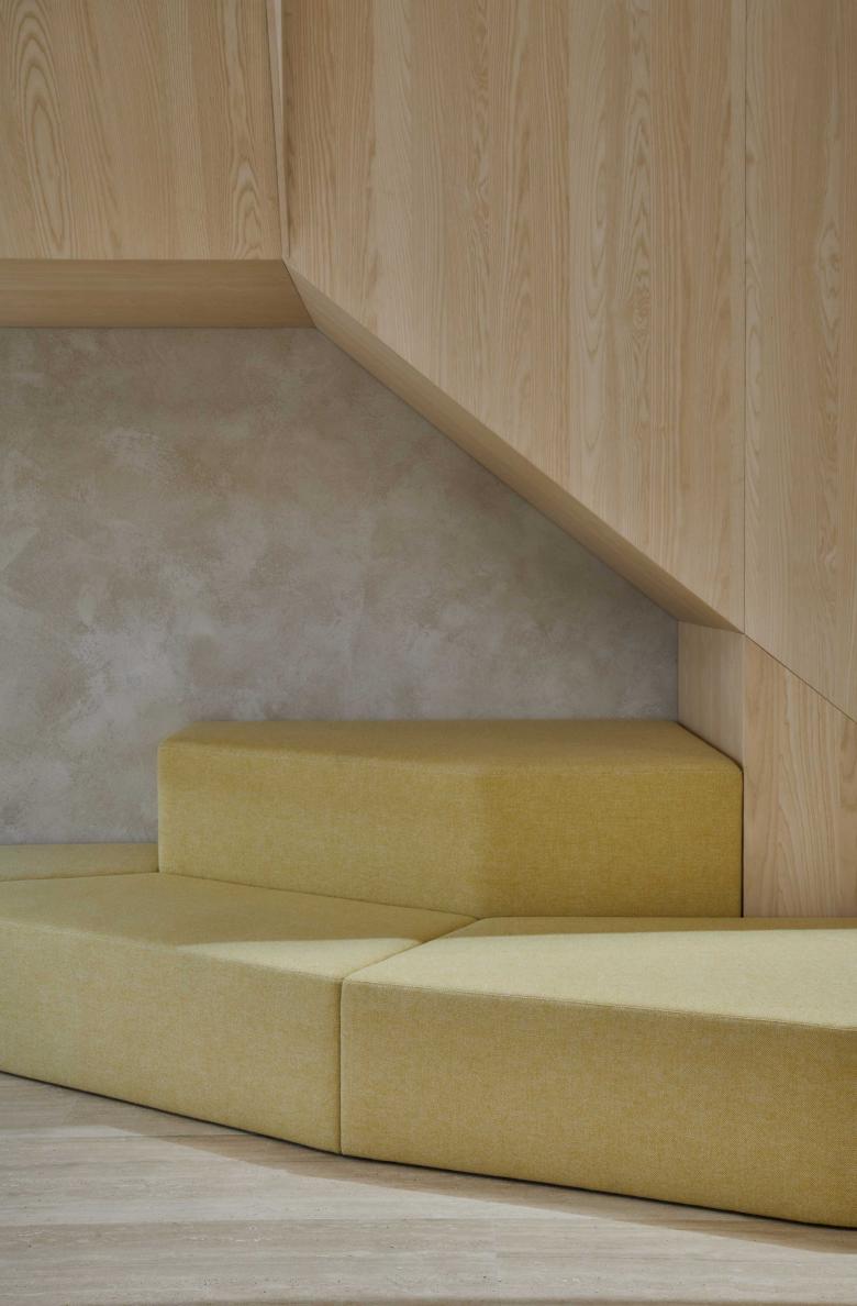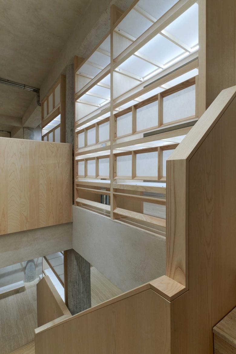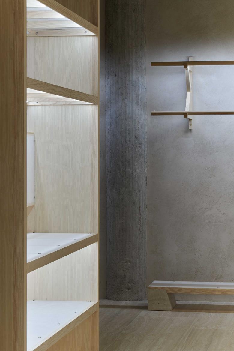 1zu33 had the role of local architect in developing Munich’s first A.P.C. store, designed by Parisian architect Laurent Deroo. Adjacent to the Aesop shop in the historic Luitpoldblock, this space equally exposes its raw concrete. The floor is laid out in Roman travertine, while the staircase balustrade and furniture are executed in light ash wood, patterned in a delicate mix of motifs and designs.