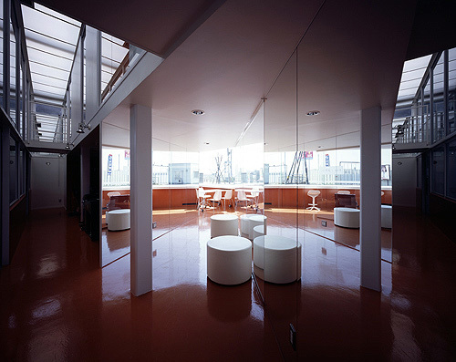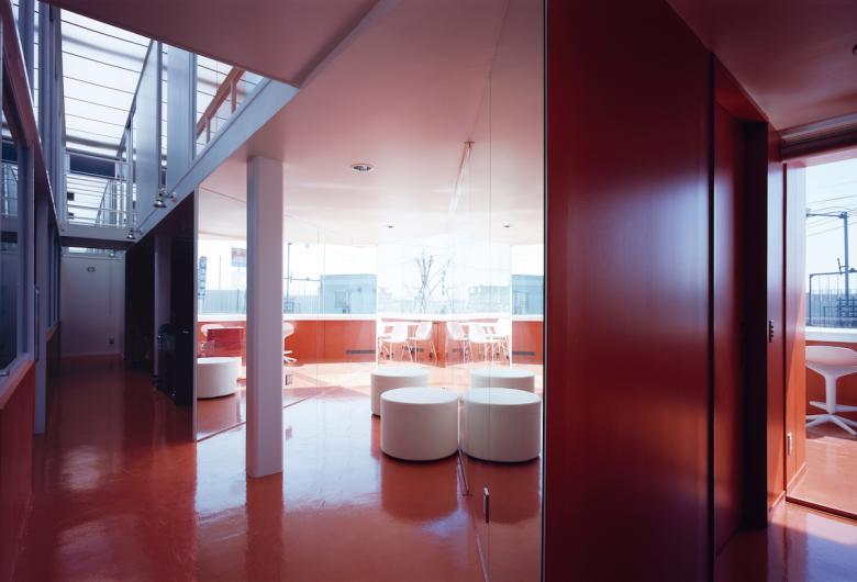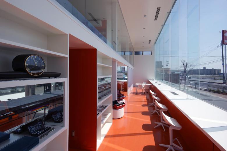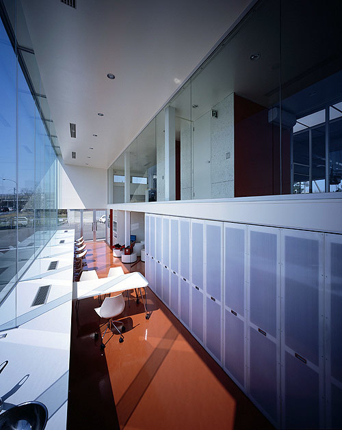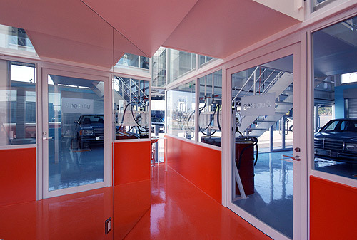 In typical suburban architecture, the interior is finished in monotonous colors such as white or beige. In contrast, this repair shop uses strong interior colors. The color changes from orange to light blue at the glass screen in the center of the building. Each time customers or employees pass this transition point, they will be reminded of the reversal of typical design principals.