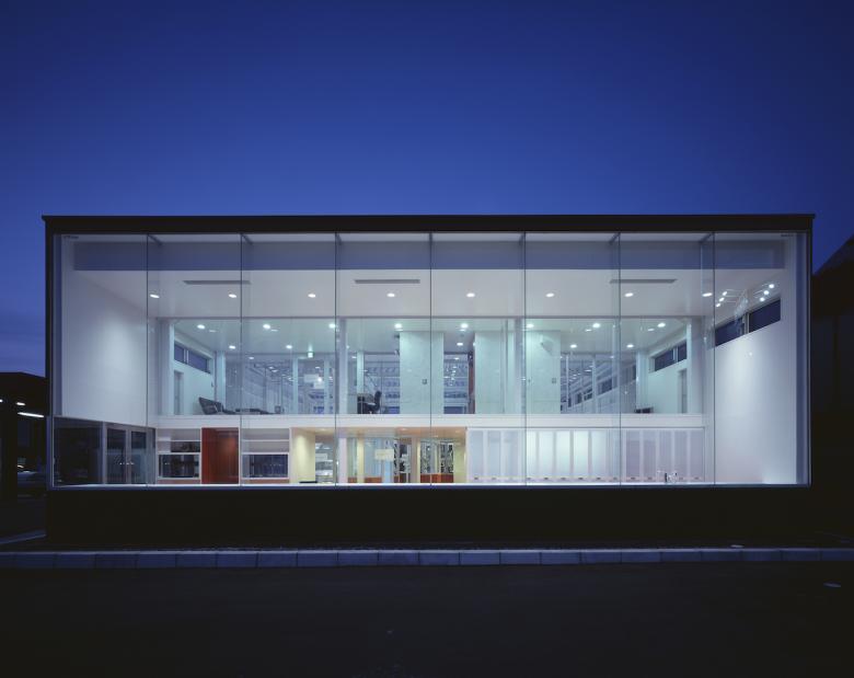 The shape of the box was based on the minimum size requirements of the building codes for auto repair shops. We also felt the functional form fit well with its suburban surroundings.