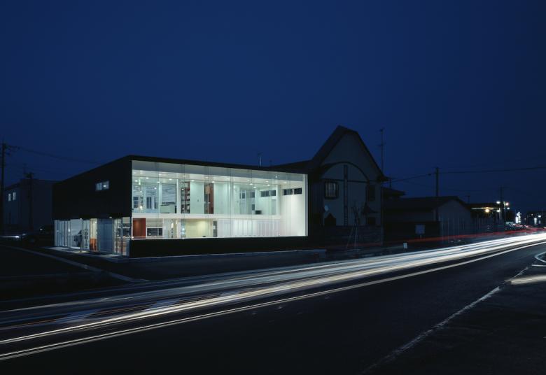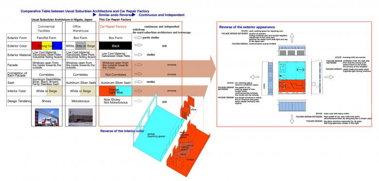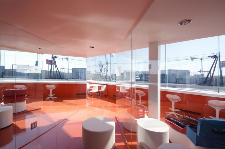 This auto repair shop located in Niigata, a large Japanese city, provides space where clients can repair their own cars in addition to standard services. Most buildings in the suburbs of Niigata are characterized either by strong colors and fanciful forms, or monotonous designs in grey or beige. With this project, we tried to create an interesting design without getting caught up in the local competition for “most fanciful building.”