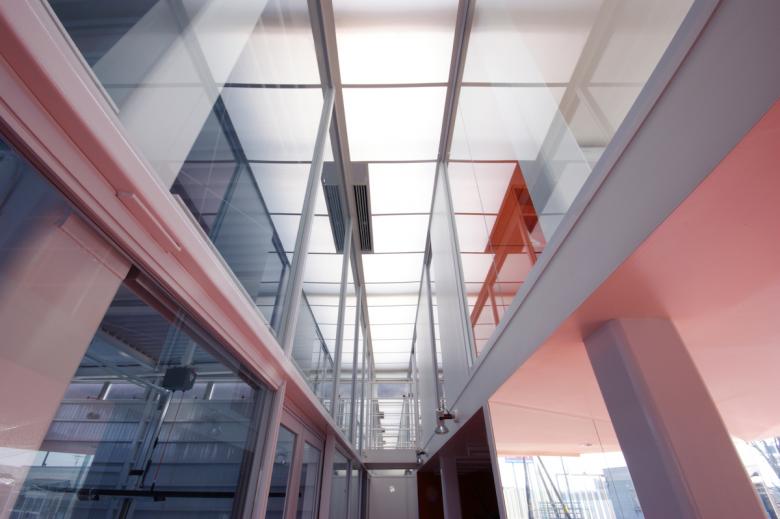 The real and virtual images of the exterior come together in the mirrored waiting area, making this a pivotal part of the building.