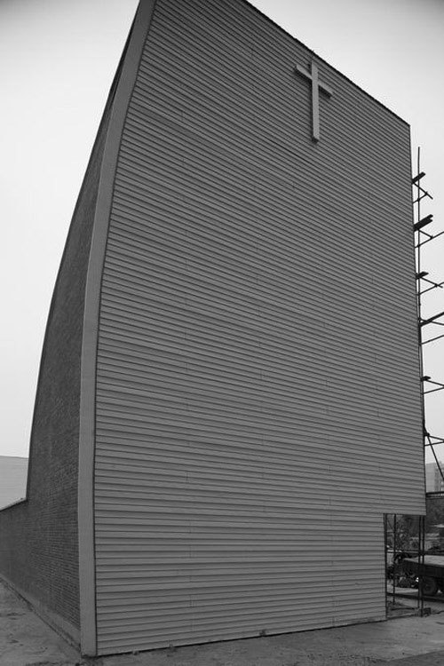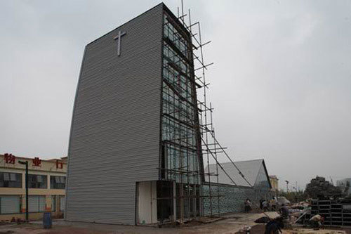 This Christian Chapel, located in Beijing Suburb, is trying to combine Western and Eastern religion spatial styles in different ways, tower vs. courtyard, glass vs. tiling roofs, etc.