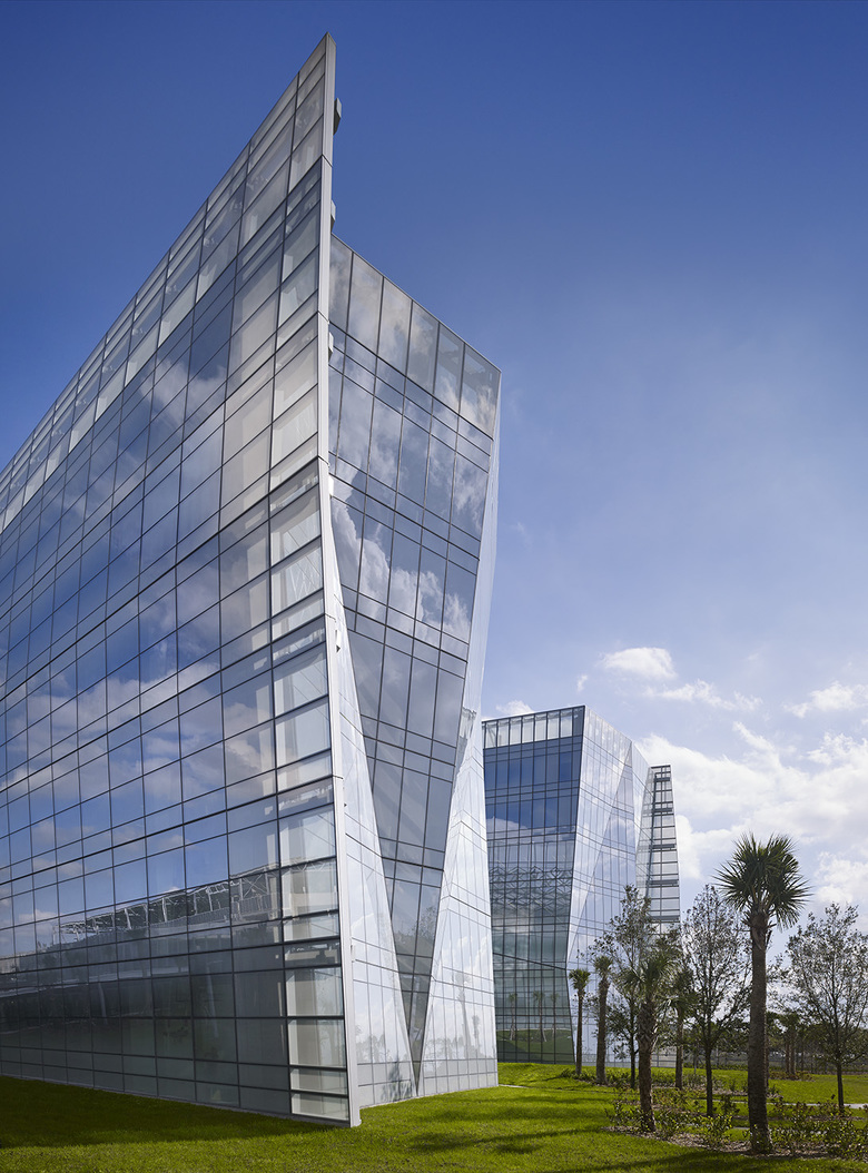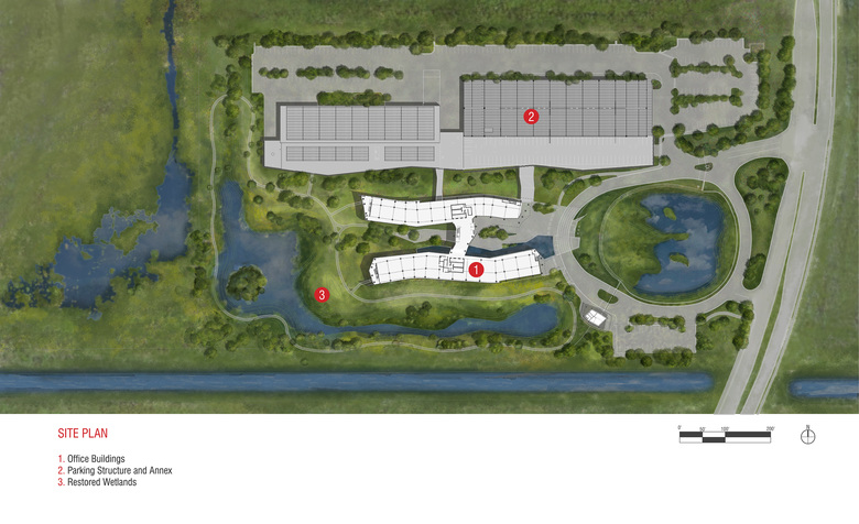 Krueck + Sexton Architects have completed a 375,000 square foot, highly sustainable Federal Office Building located at 2030 S.W. 145th Avenue in Miramar, FL. Developed under the GSA Design Excellence Program and occupied by the FBI, the campus buildings are oriented and shaped in response to the local climate, natural environment, and agency needs. As a result, the office building maximizes daylight and views while minimizing energy consumption, and provides a superior workplace for federal agents. Restored natural wetlands of the Florida Everglades make up the majority of the 20-acre site, connecting the campus to its native community while visually integrating high-performance perimeter security features.