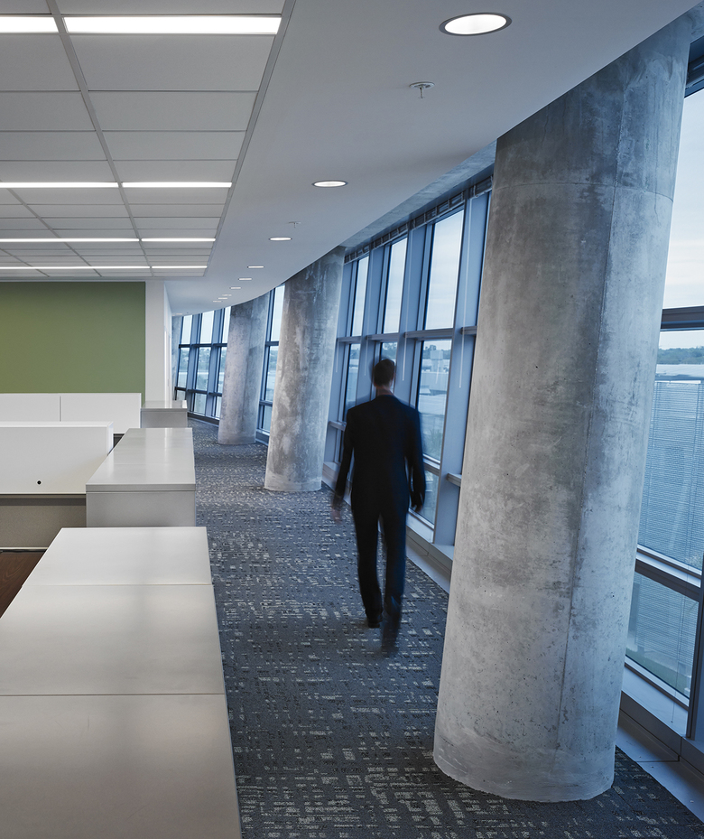 The all-glass building skin, which allows expansive views over the restored wetlands, consists of insulated window units, which are designed to withstand blast and hurricane impacts. Various glass coatings in combination with exterior perforated metal sunscreens are fine-tuned to maximize interior illumination while controlling excessive perimeter glare and significantly reducing solar gains. Both the office building and its site offer a user and visitor experience unlike any other federal facility.