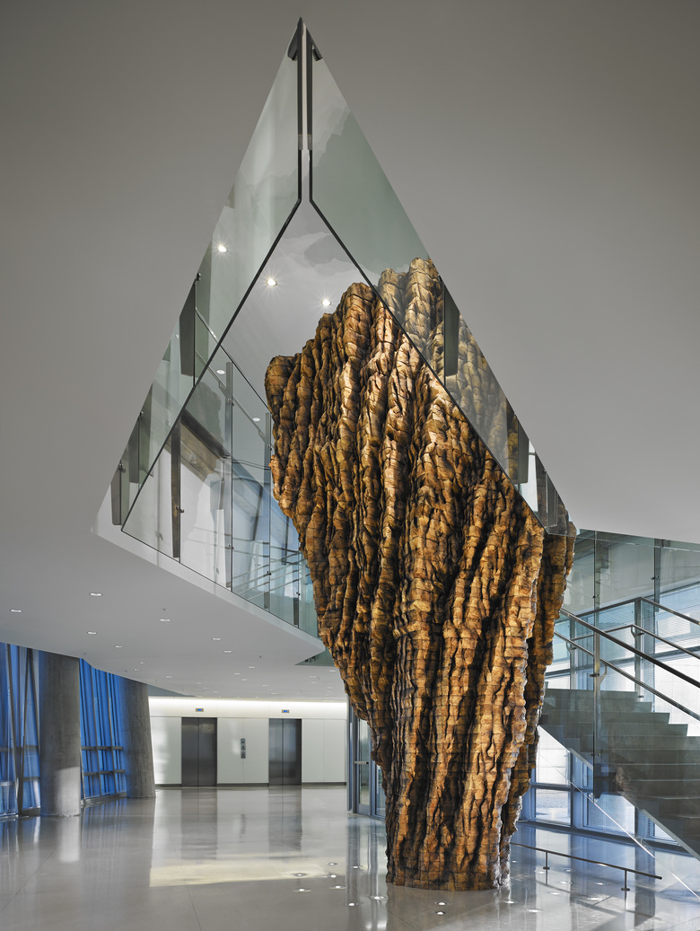 As part of the GSA Art-in-Architecture program, a 23-foot tall cedar sculpture by German-born, Brooklyn-based Ursula von Rydingsvard will be placed in the entry lobby atrium. Ascending the lobby staircase, one will be very close to the body of the sculpture, stimulating a physical and sensory experience.