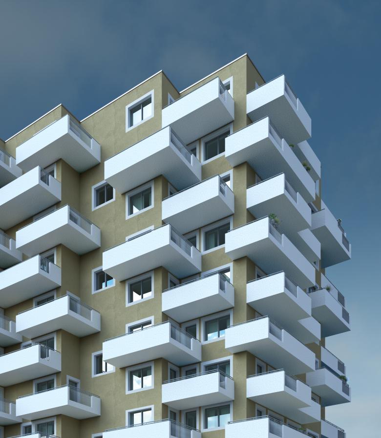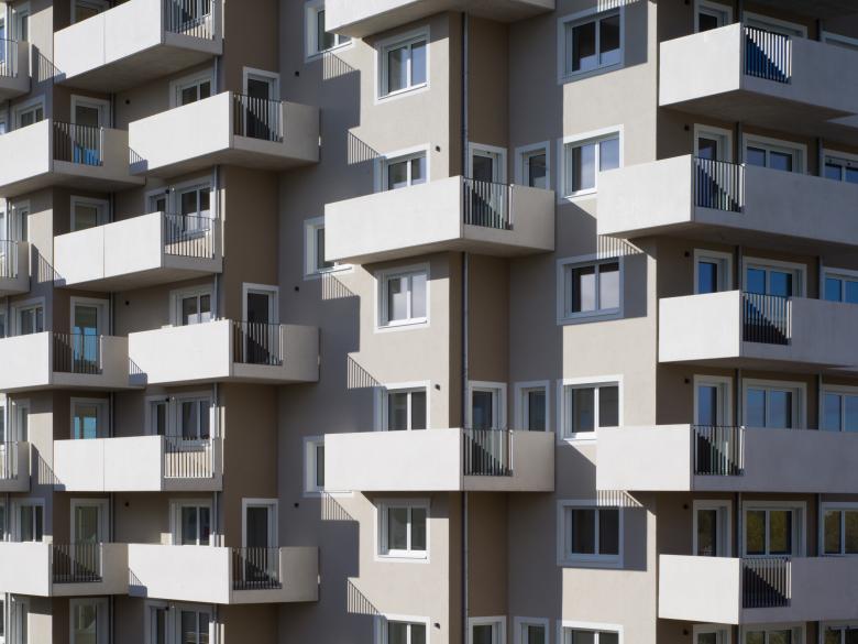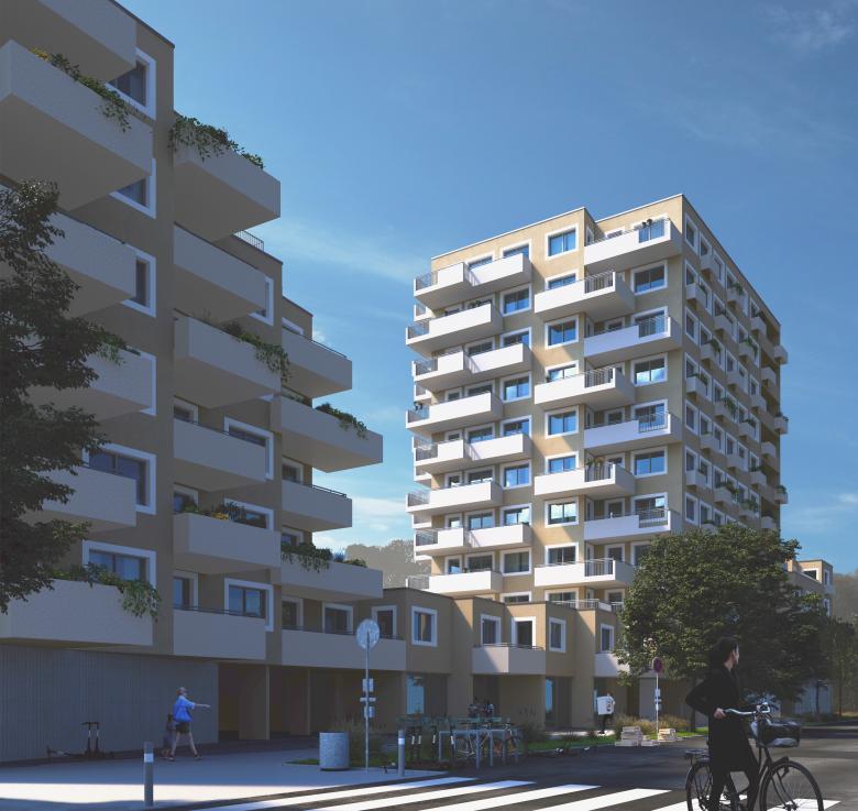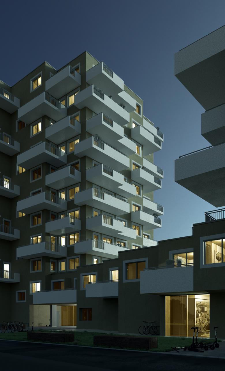 The facades at the property boundaries are formulated as clear urban planning edges, the sides facing facades of the project area are loosened up by a play of the balconies.