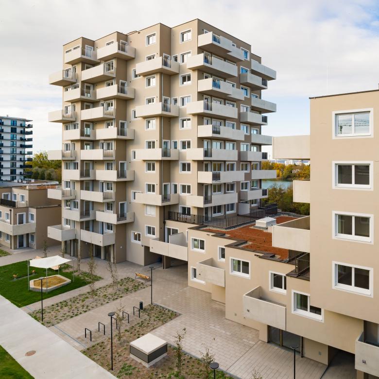 The project Ber – Housing Berresgasse is located directly on the Hirschstetten bathing pond and forms the gateway to the new Berresgasse development area. 100 freely financed apartments with spacious open spaces in the form of balconies and terraces form the building structure and are the defining element of the project. On the ground floor there are two business premises and spacious common rooms.