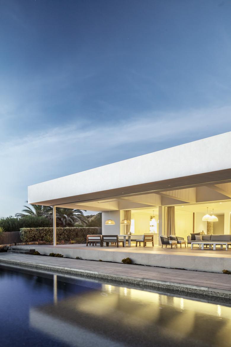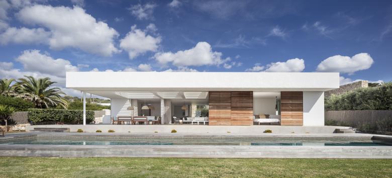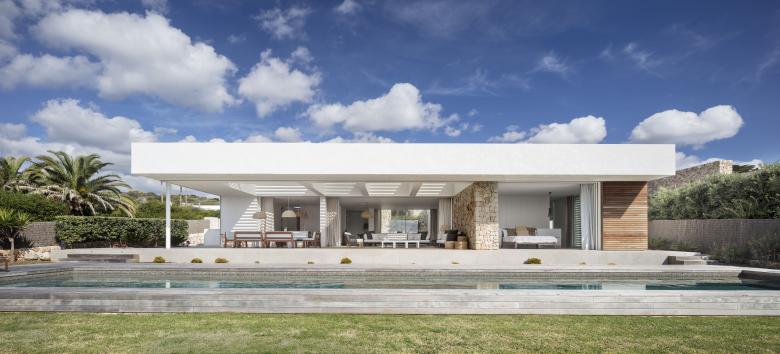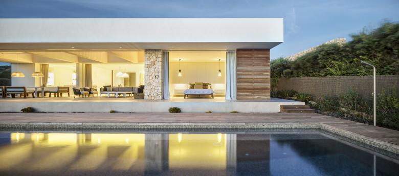 The first step was to take maximum advantage of the breadth of the plot to appreciate the views over the Mediterranean and make the architecture blend into the landscape. The idea was to create a wide span in order to achieve exaggerated openings with glass doors that glide across and disappear behind walls, making the house itself retreat into the background.