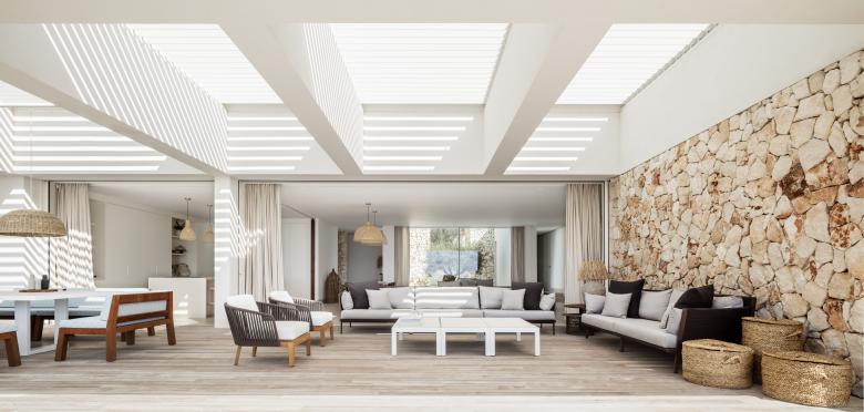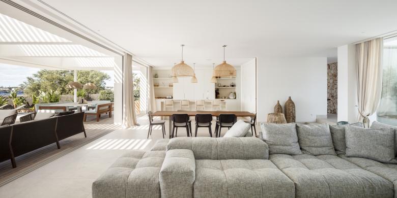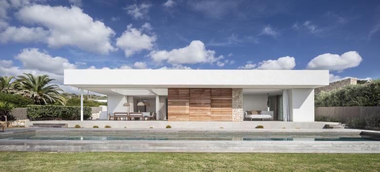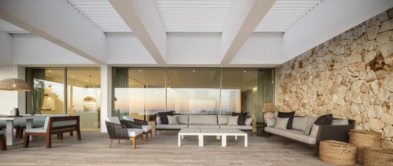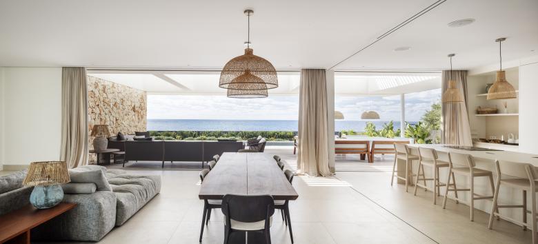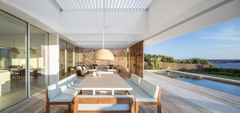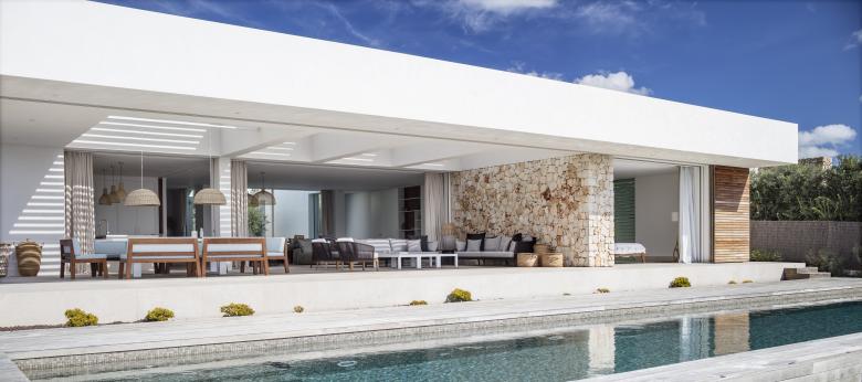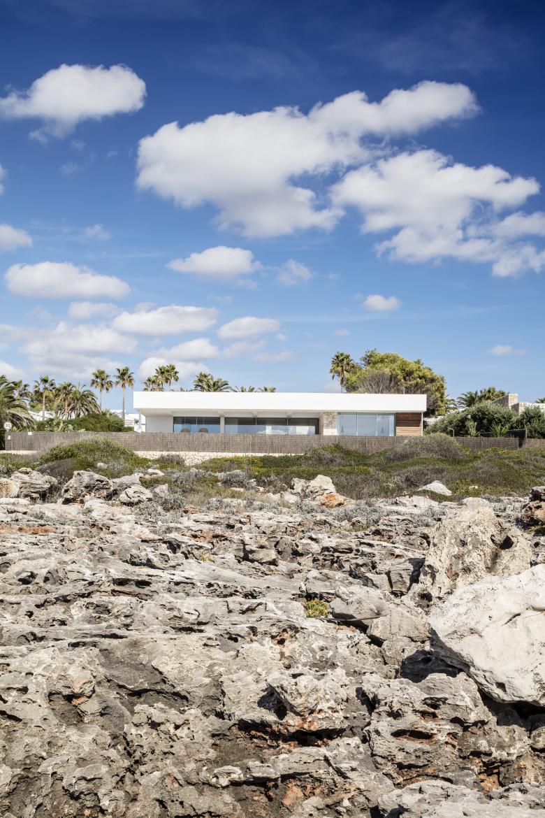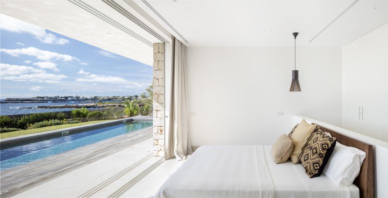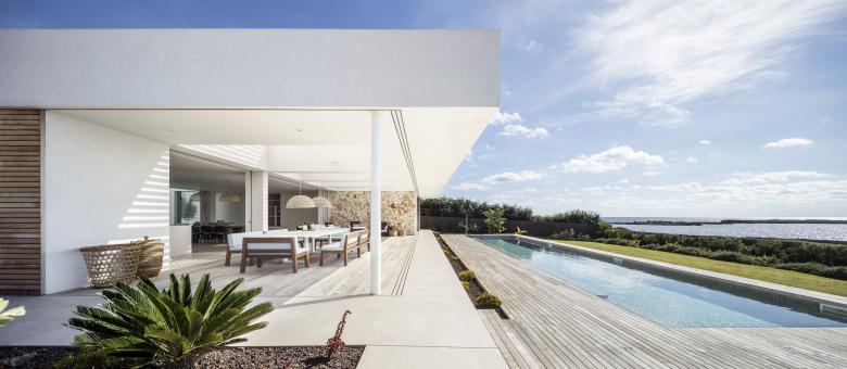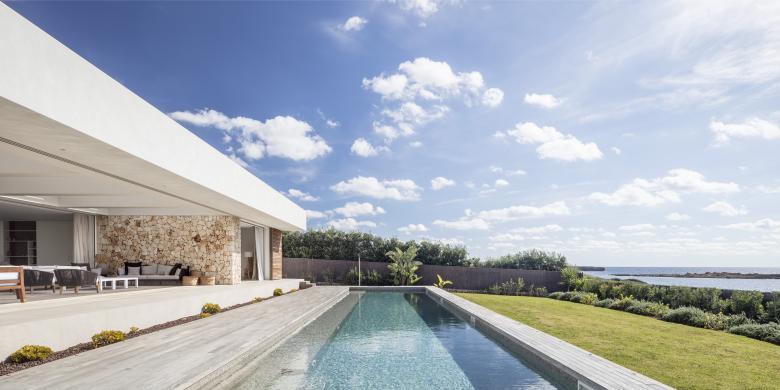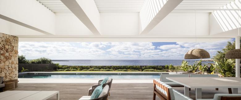 Glass, wood, white plaster and ochre tones enhance the essence of this frontline property that is just metres from the Mediterranean. The house is designed for an urban family with a nod at Menorcan tradition. The option here is to simply wander down to swim from the rocks, not a beach.