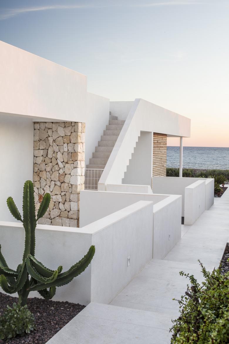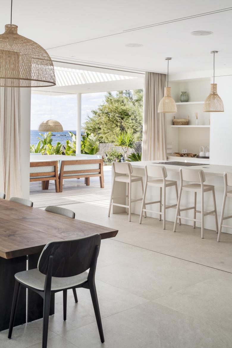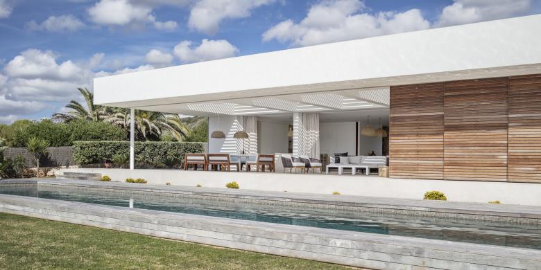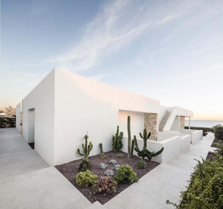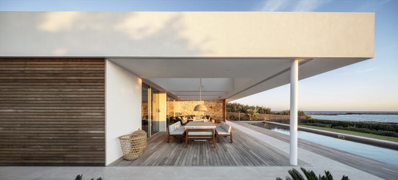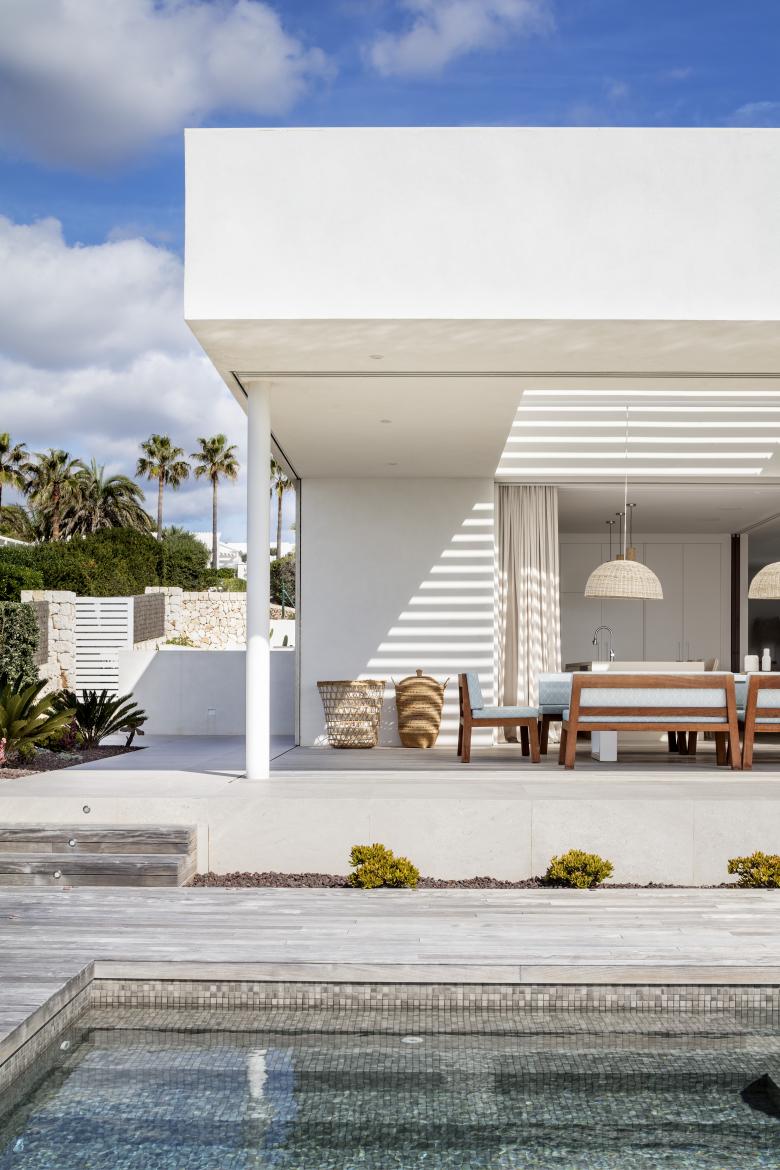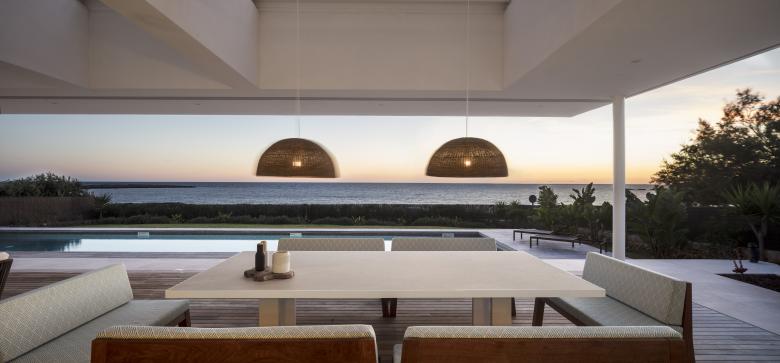 Glass, wood, white plaster and ochre tones enhance the essence of this frontline property that is just metres from the Mediterranean. The house is designed for an urban family with a nod at Menorcan tradition. The option here is to simply wander down to swim from the rocks, not a beach.