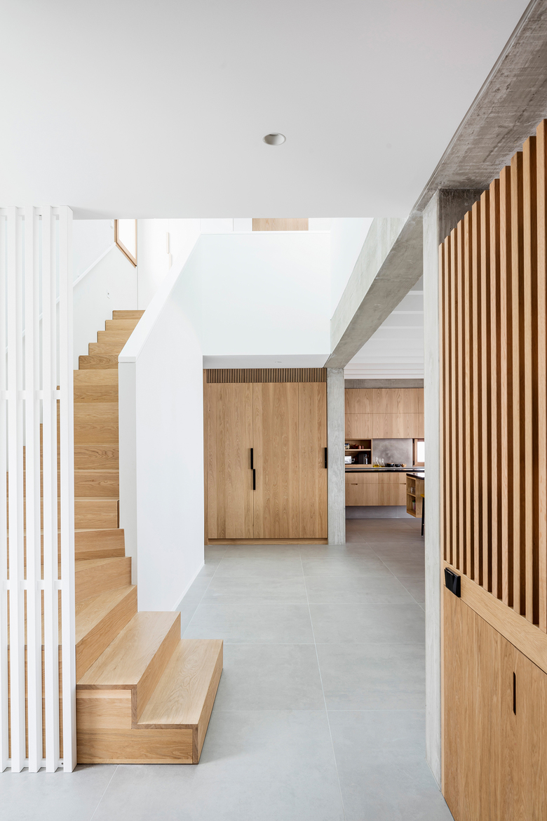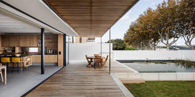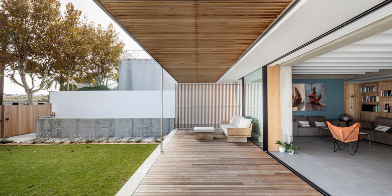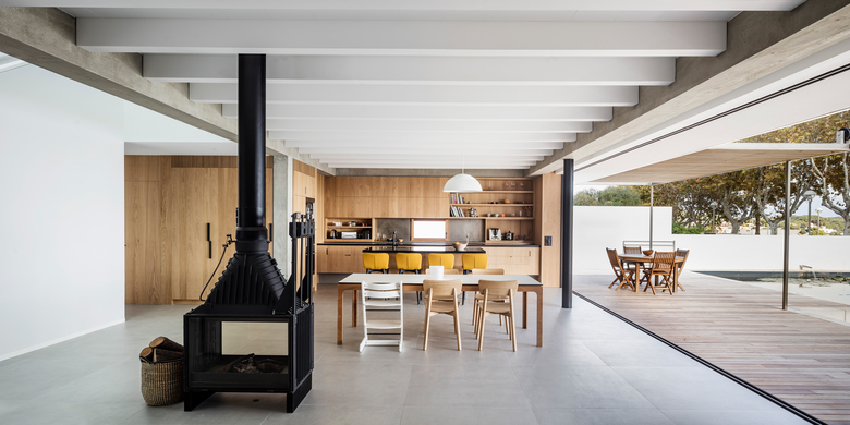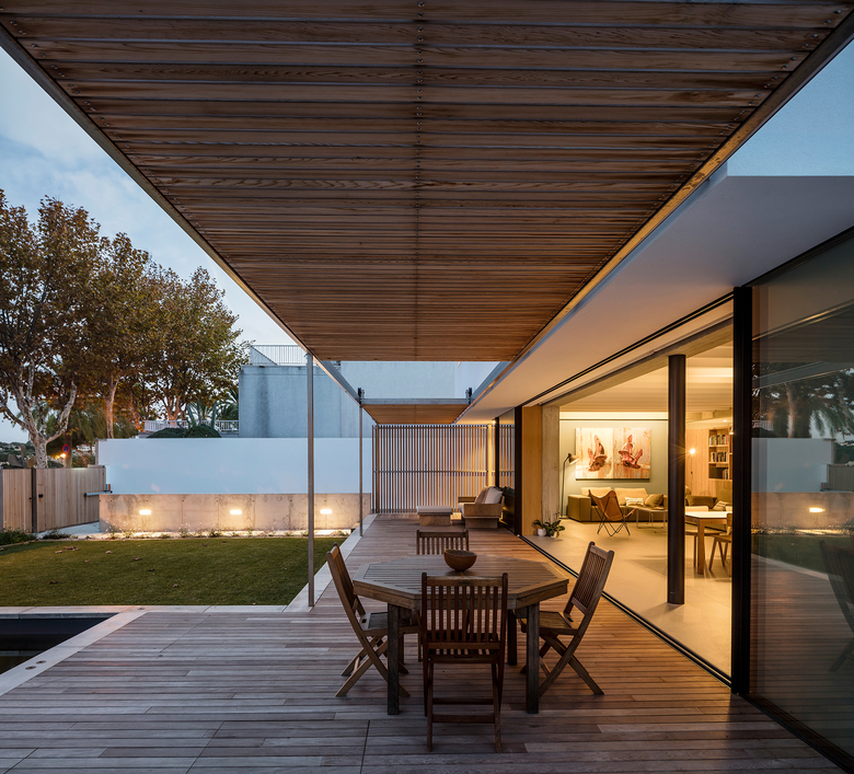 The project for this property intended for a family had a very specific programme right from the start. The house boasts an unobstructed open‐plan area to house the communal rooms, facing east and allowing maximum window space. The bathrooms face west with minimum apertures. The kitchen/dining section opens out completely into the garden and pool, transforming itself into a well‐ventilated porch area for summer use. A sliding pergola allows for the control and filtering of the sunlight.The fully rational first floor has four bedrooms of identical layout facing east, with 3 bathrooms facing west. The house’s vertical communication core is a dual space that provides both light and generates air currents, with a large fan aiding this function. The access staircase merges with a gallery on the first floor while giving continuity to both floors.