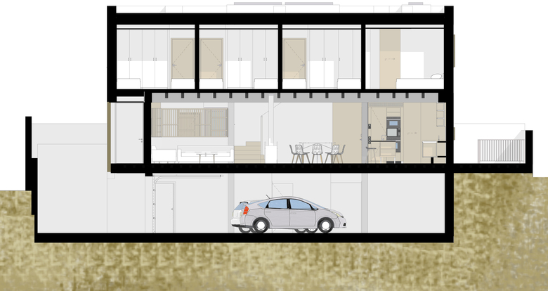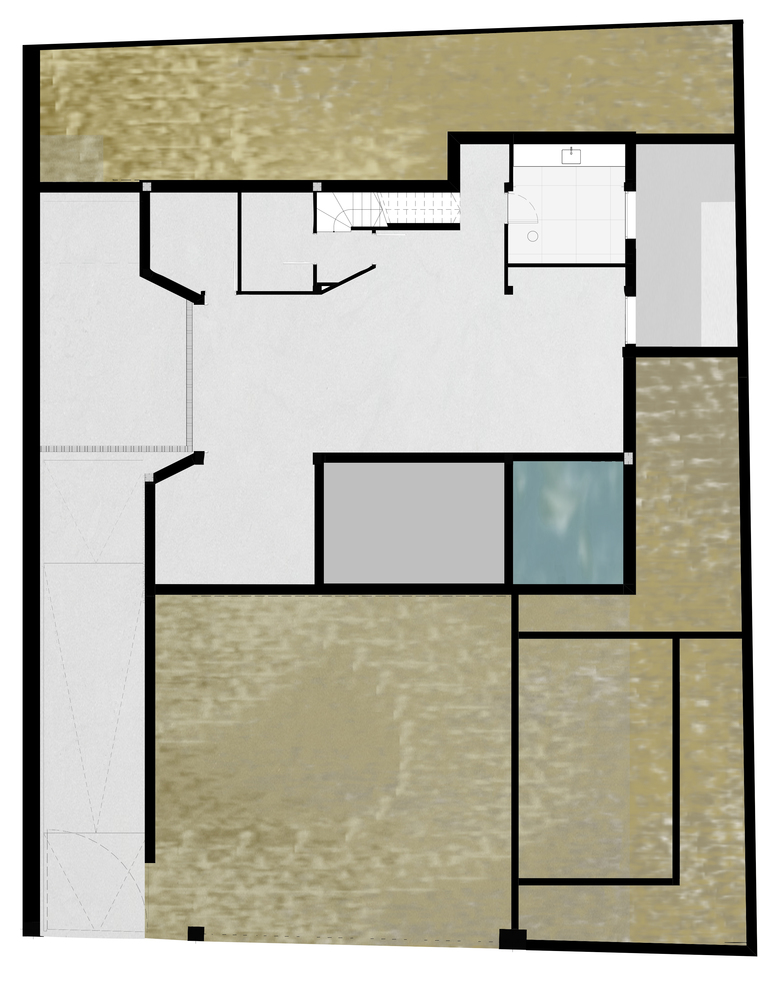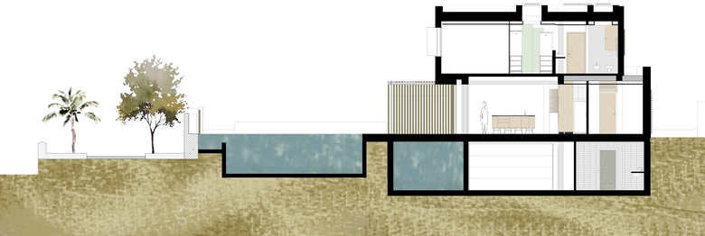 Our obsession for natural ventilation led to us designing shutters that are completely level with the east façade and operated via electric pistons. The basement has a laundry, garage and courtyard that provides light. There is also a 35‐ton water tank which catches rain‐water from the building’s roof. The house is further complemented by a completely natural swimming‐pool containing indigenous plants that border the walls of the plot to add freshness and colour in summer.