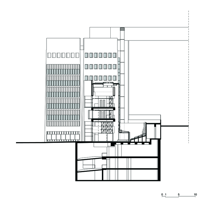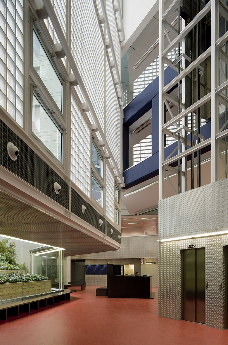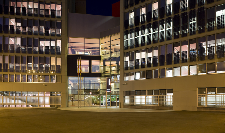 The site of the Police Station lay wedged between the converging of two of Barcelona's main avenues and faced the circular square “Plaça d'Espanya”. The urban solution had to solve the problem of different height regulations between the two avenues and at the same time address the monumentality of the circular place. The decision to create a building with two wings was weighed by the fact the three separate police organizations were required to share a common entrance and vestibule for a waiting public. Given that it was to be a representative building of the law enforcement in a democratic society the vestibule had to have an air of friendly assistance to the public while observing all the required security arrangements. The four-storey glazed atrium with a garden court beyond is set between the two wings. The façades are composed with a continuous module of galvanized steel fins enclosing the glazing screened with photovoltaic balconies on the south and west sides to use the solar energy as a clean sustainable energy integrated into the building. There is a vague classical reference to base, column, and cornise, typical of the buildings in Cerda's grid center, with glass-brick screens at the base and plain concrete walls pierced with windows at the top.