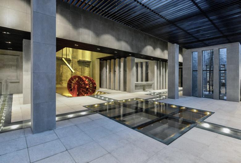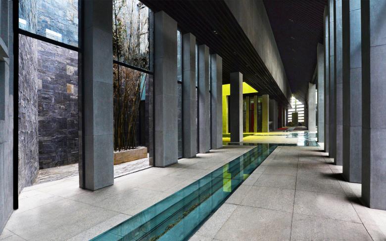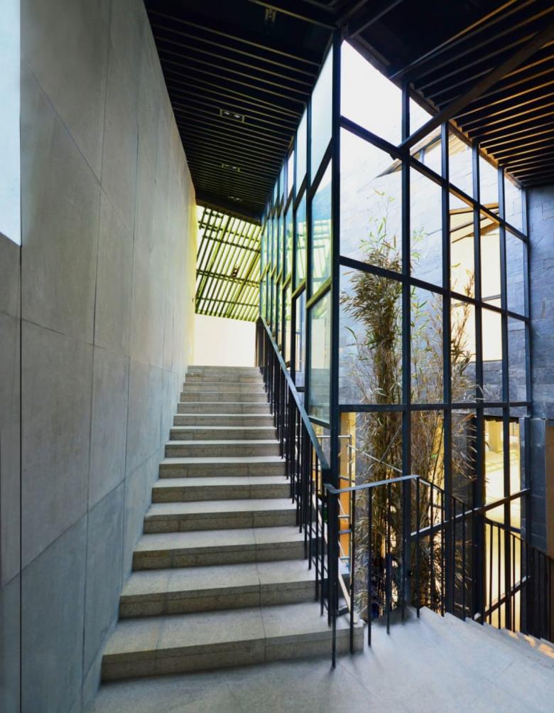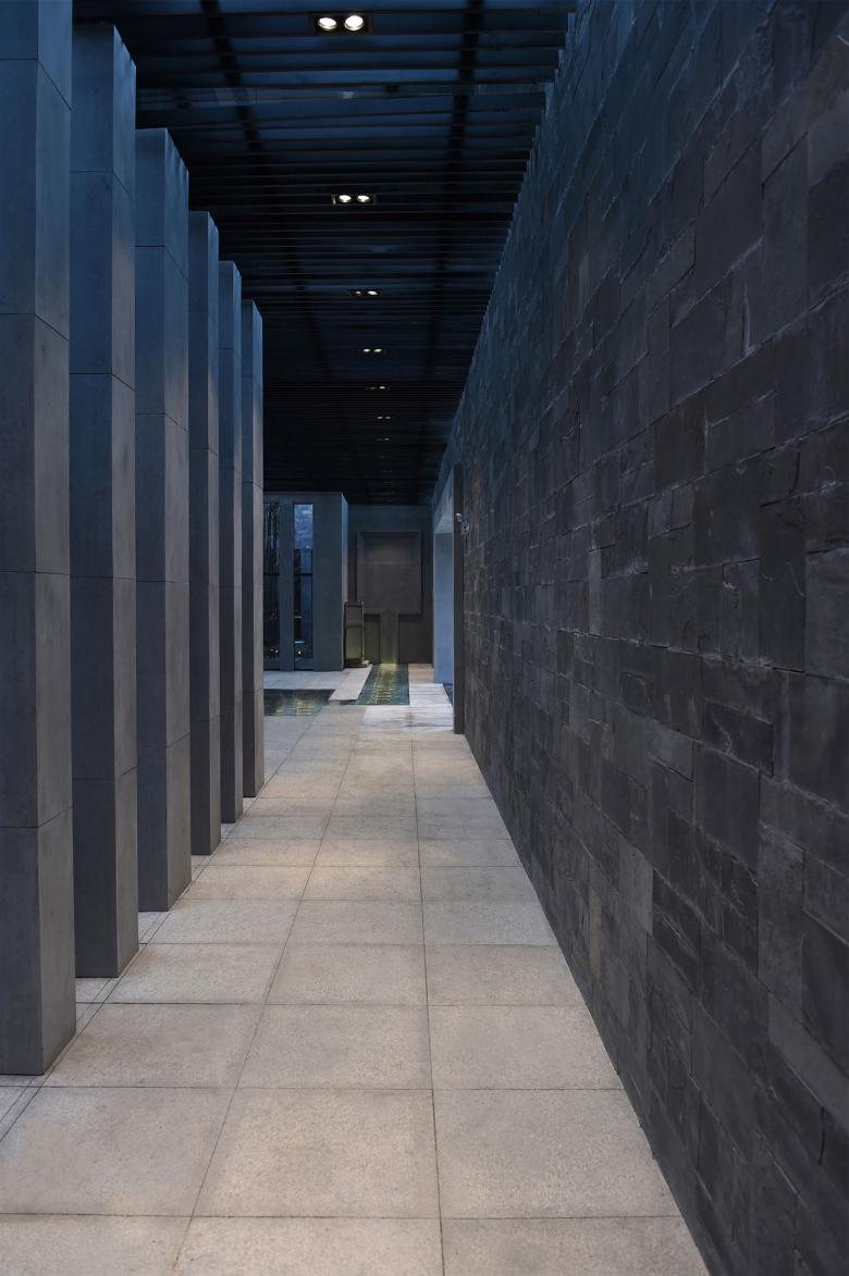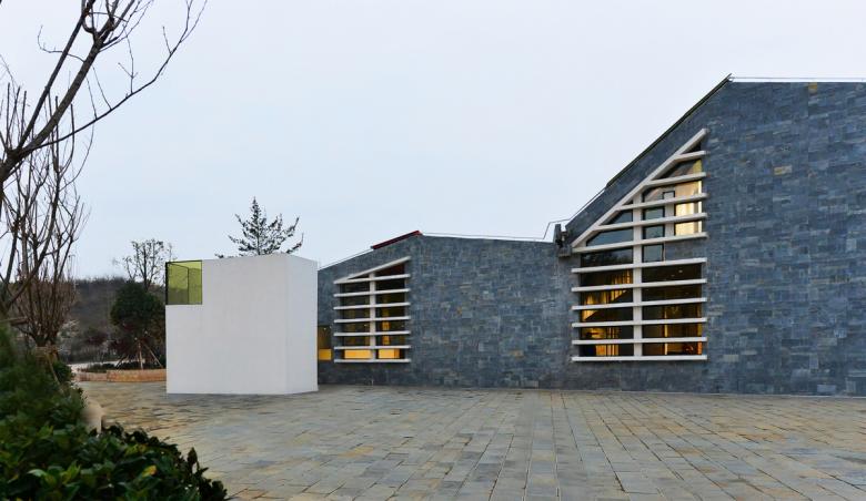 The third band is the largest volume on site and it is categorized as “Tang” (堂), hall. Here are located the visitor center's public functional areas: reception and info point, an exhibition hall and a tea room. Upstairs is the private office area. The interior units follow the parallel flow and have been partitioned according to their functions. Architects deliberately designed the turn near the south end of the first band and the second band in order to combine the three bands into one structural group. Group which still preserves the singular L-shaped units in aim of retaining the relative independence among the parallel bands, while gaining the benefits of uniformity and integrity.