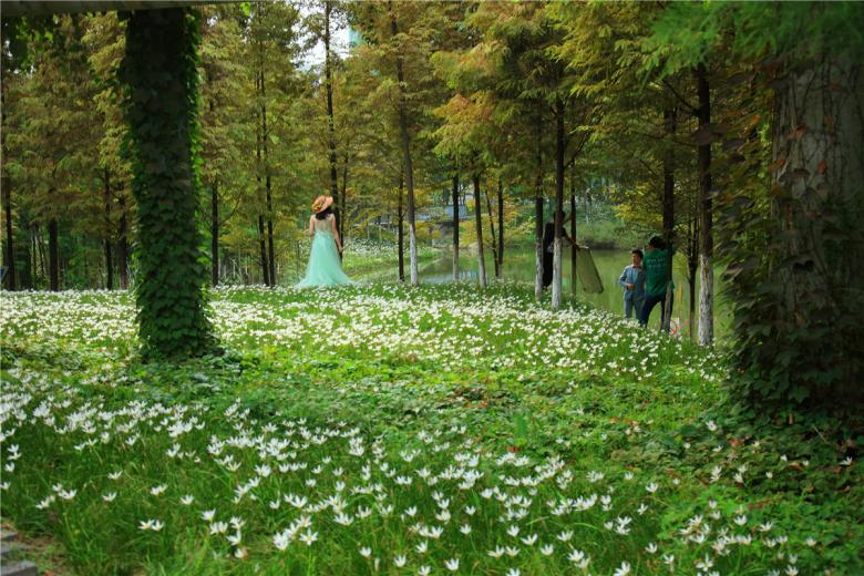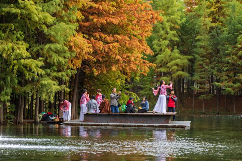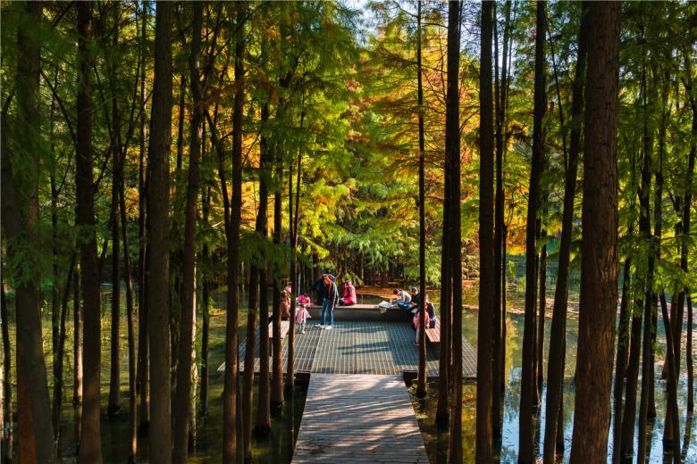 (2) Planting patterns to rejuvenate the fishpond landscape: The barren and featureless fish farm is transformed into a lush oasis by the designed planting of native vegetation: glyptostrobus and dawn redwood trees , which are considered to be “living fossil” trees found in this region. They are planted in dense patches to create volumes that break up the monotonous fishpond landscape. Chinese tallow trees are planted on the bank of the canal at the north side to create a continuous greenway that will connect the park with other greenspaces along the canal. Hackberry, ginkgo and liquidambar are planted at the entrances and meeting places for shade. The ground cover is composed of self-seeding annuals and perennials and the ponds are planted with wetland species including lotus, cattails, reeds, etc. to strengthen the filtration function of the ponds.