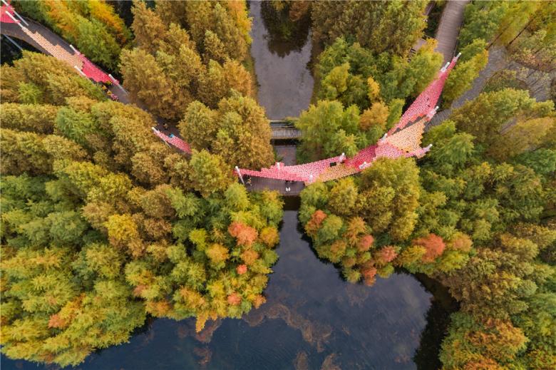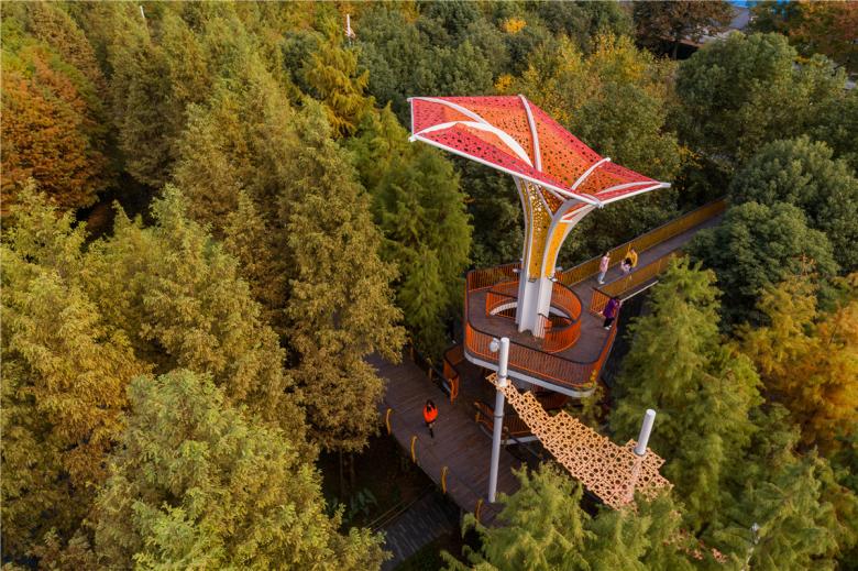 (3) A network of paths and skywalks for universal access: A network of pedestrian paths incorporates the pond dykes and additional bridges over ponds. Local materials are used to pave these paths. The bridges are made of simple concrete, the design of which is inspired by local terraced bridges used for fetching water from the ponds. A skywalk flying above the tree canopy winds across the park and provides easy access to urban residents – especially those in wheelchairs–who live at street level ten meters above the park.