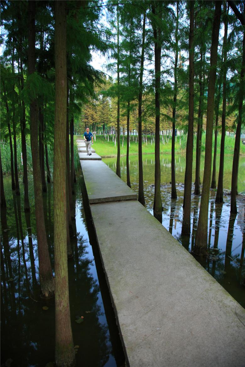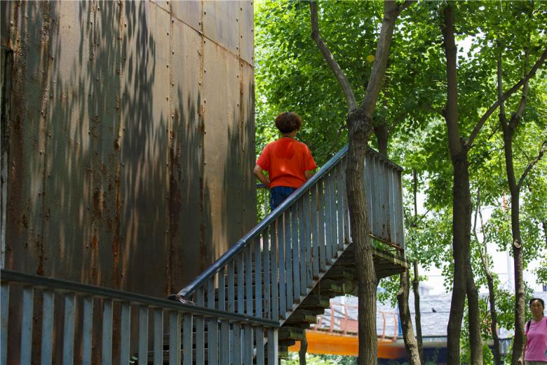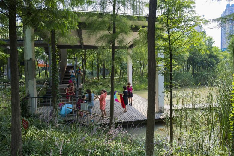 (4) Intervention structures create a rich experience: Multiple platforms, pavilions and towers are scattered throughout the park. These structures function to rectify the differences in elevation between the park and the urban street; they create access from the fishpond dykes to the bottom of the pond area; they connect the skywalk to the ground, as well as provide a rich experience for exploring and resting. These subtle interventions make the otherwise monotonous spaces rich and inspiring.