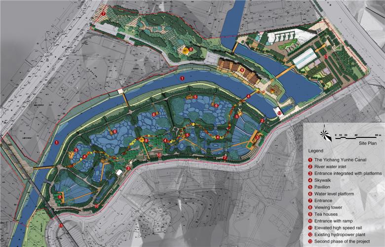 The Yichang Yunhe Park is located in the center of the East New Eco-city of Yichang. Situated in a small basin within a hilly landscape, the park has a canal along its north side, a high-speed train track to the west and urban street to the south. Like other Chinese cities, Yichang is experiencing rapid urban growth that is encroaching into the surrounding agricultural land. The twelve-hectare (30 acre) site was previously a fish farm comprised of twelve fishponds. The site was planned as a park (the land use planning was also done by the landscape architect), since it was unsuitable for urban development but had the potential for transforming the canal into a greenway that would run through the city.