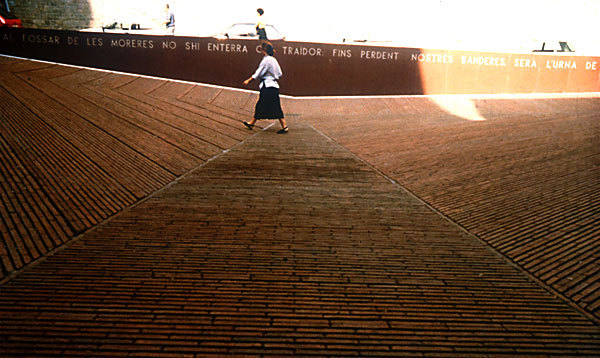 which define the polygonal geometry, lend to the concavity a tectonic character, emphasized by the lines of shadow varying through the day. This materiality of the brick paving contrasts with the incisions made in the polished red granite frontispiece, in the manner of a lectern, with the dedication of Serafí Pitarra: "To the martyrs of 1714: in the Fossar de les Moreres no traitor is buried, even if we lose our flags it will be the urn of honour."