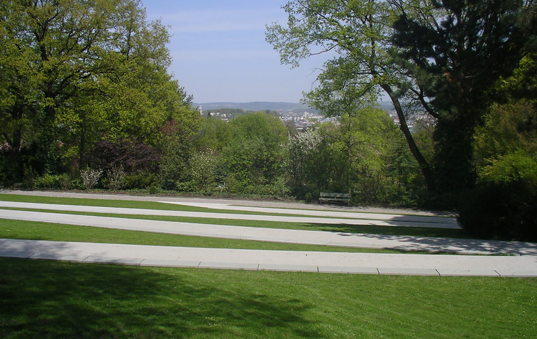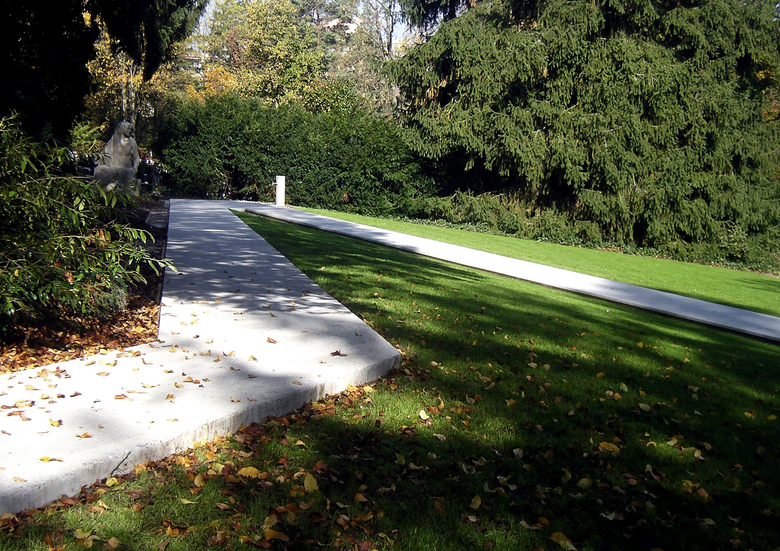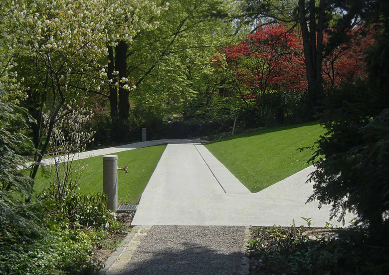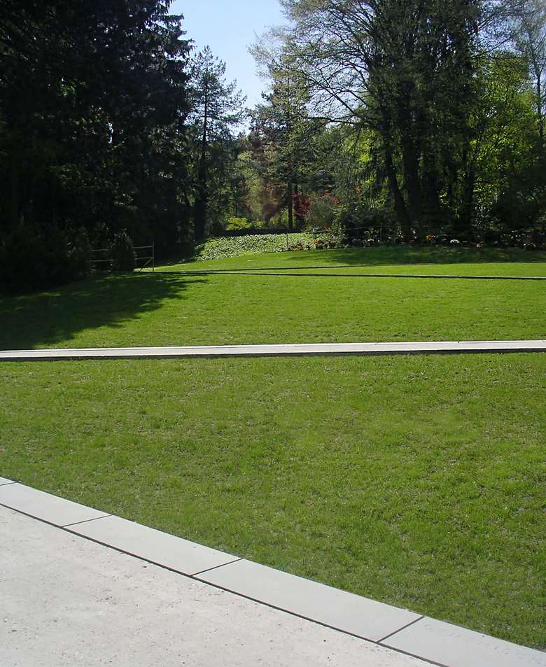 Das dichte Wegnetz ermöglicht einen unmittelbaren Bezug zu den einzelnen Grabstellen. Der neue Weg in Beton wird bergseits durch Natursteinbänder begleitet. Auf Wunsch werden hier Namen und Jahreszahlen der Verstorbenen eingraviert.