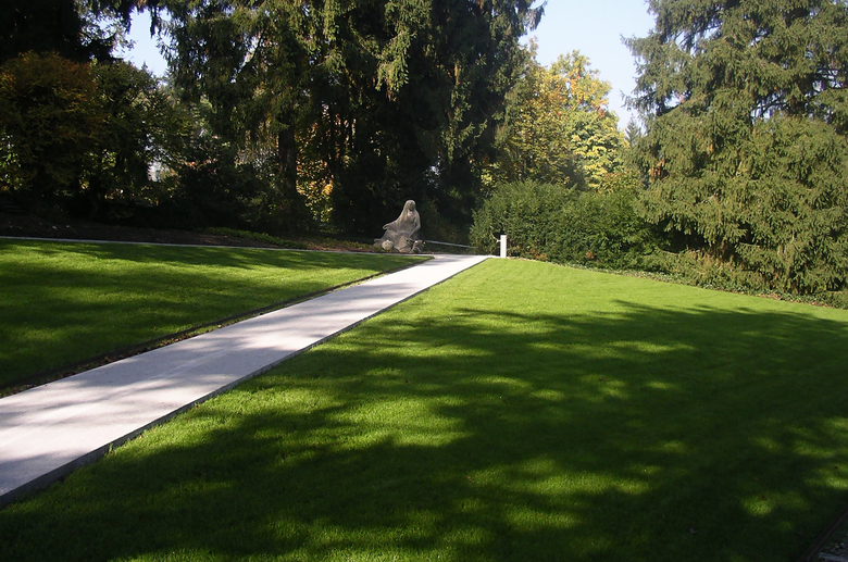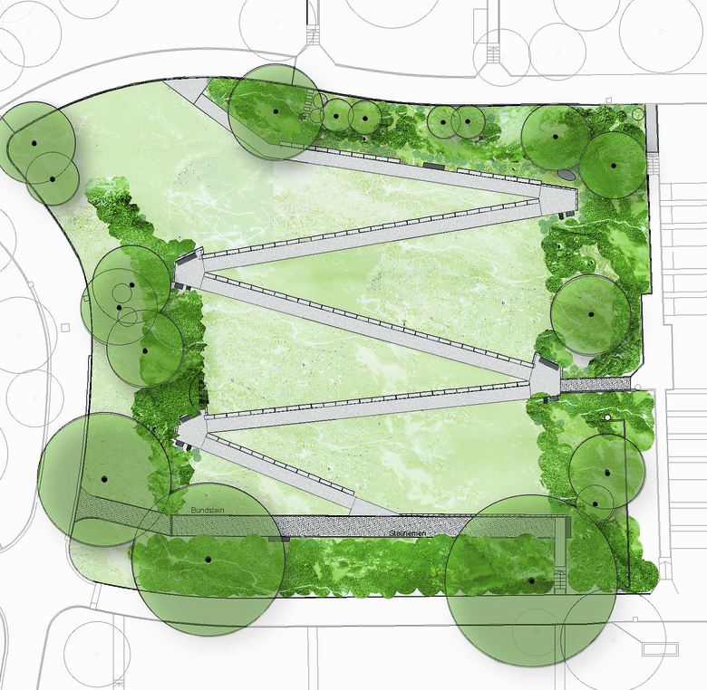 Das Konzept baut auf den vorhandenen Qualitäten des Bestandes auf. Ein neuer Zick-Zack-Weg überwindet bequem die Höhendifferenz der sanft abfallenden Rasenfläche und erschliesst gleichzeitig die sich darin befindenden Grabfelder. Der Blick wird durch die Wegführung und die Ausrichtung der peripher angeordneten Sitzgelegenheiten immer wieder auf bestehende Pflanzengruppen, Solitärbäume oder Aussichten gerichtet. Durch das Weglassen von weiteren Gestaltungselementen wird der Weg zum Zeichen für das neue, erweiterte Gemeinschaftsgrab. Die vorhandene Skulptur überblickt an neuer Lage die gesamte Grabstätte.